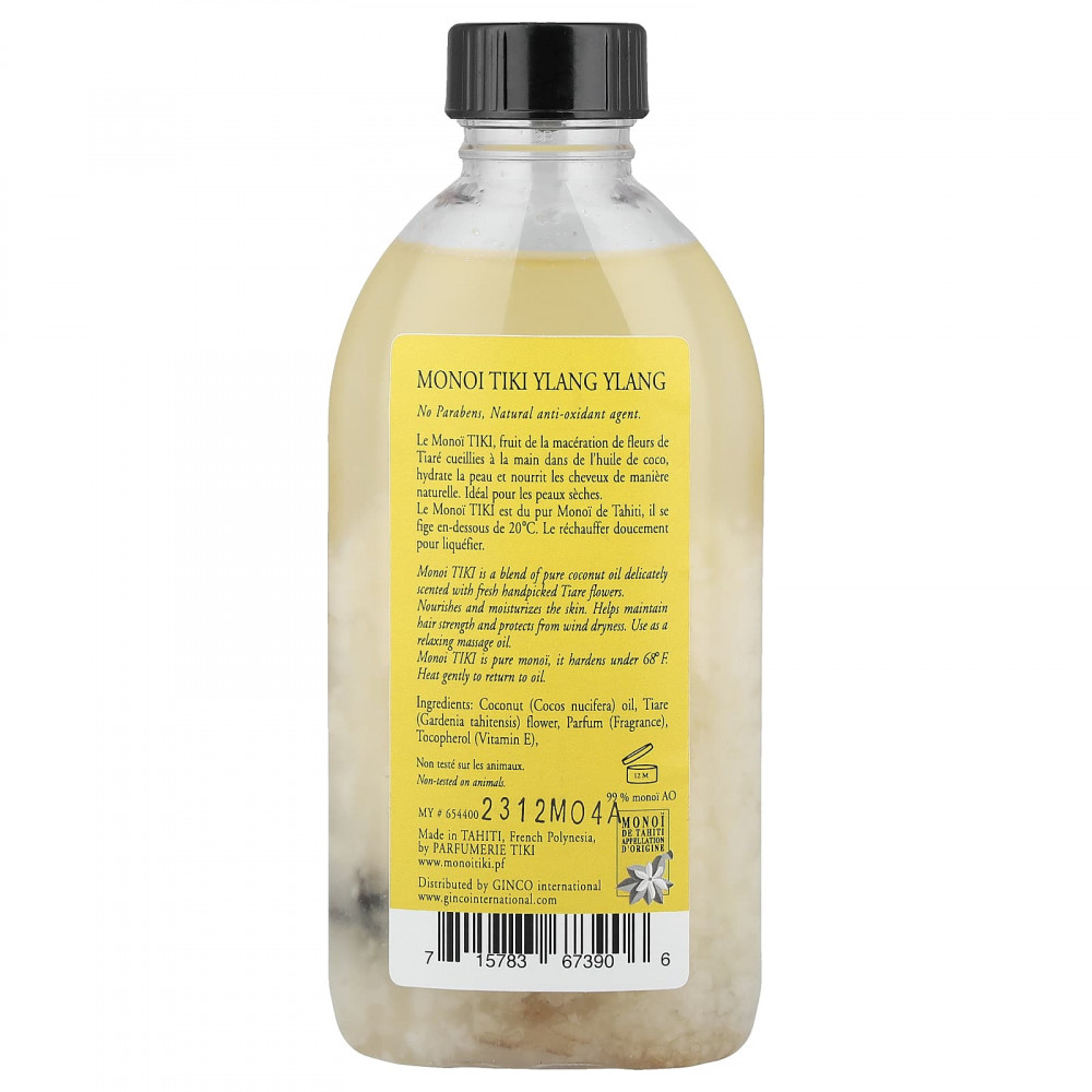 Monoi Tiki — это чистый монои, который затвердеет при температуре 20 °C (68 °F). Осторожно нагрейте, чтобы снова стать маслом.