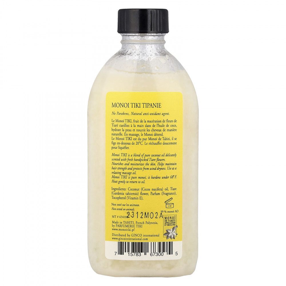 Monoi Tiki — это чистый монои, который затвердеет при температуре 20 °C (68 °F). Осторожно нагрейте, чтобы снова стать маслом.