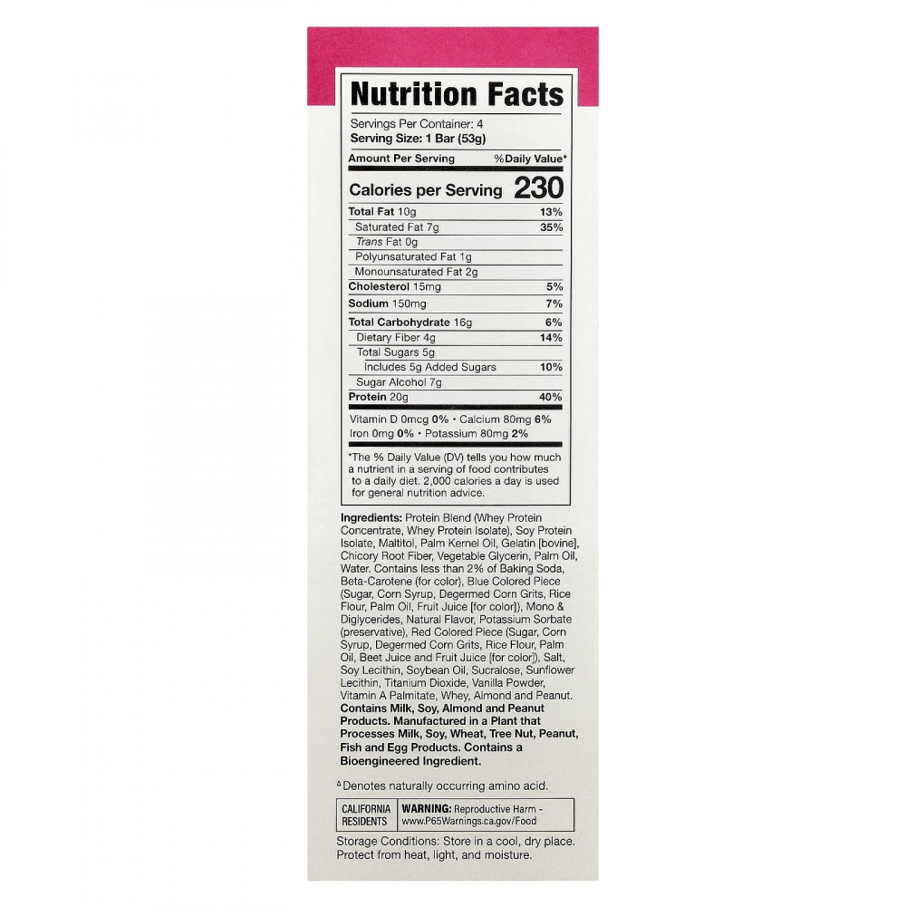 Протеиновая смесь (концентрат сывороточного протеина, изолят сывороточного протеина), изолят соевого белка, мальтит, пальмоядровое масло, желатин [бычий], клетчатка из корня цикория, растительный глицерин, пальмовое масло, вода. содержит менее 2% пищевой соды, бета-каротин (краситель), кусочек синего цвета (сахар, кукурузный сироп, обезжиренная кукурузная крупа, рисовая мука, пальмовое масло, фруктовый сок [для цвета]), моно- и диглицериды, натуральный ароматизатор, сорбат калия (консервант), кусочек красного цвета (сахар, кукурузный сироп, обезжиренная кукурузная крупа, рисовая мука, пальмовое масло, свекольный и фруктовый соки [для красителей]), соль, соевый лецитин, соевое масло, сукралоза, подсолнечный лецитин, диоксид титана, ванильный порошок, витамин A (пальмитат), сыворотка, миндаль и арахис.