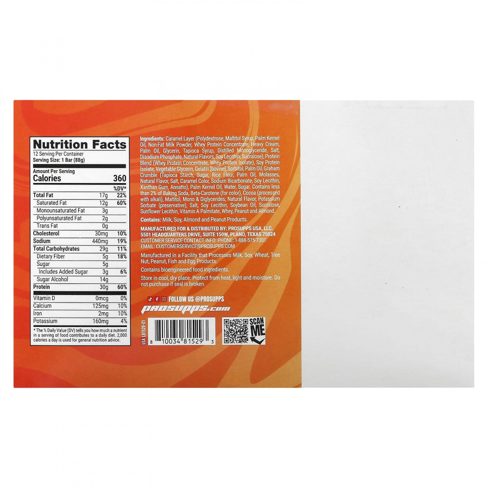 Карамельный слой (полидекстроза, мальтитный сироп, пальмоядровое масло, порошок из обезжиренного молока, концентрат сывороточного протеина, жирные сливки, пальмовое масло, глицерин, тапиоковый сироп, очищенный моноглицерид, соль, динатрия фосфат, натуральные ароматизаторы, соевый лецитин, сукралоза), протеиновая смесь (концентрат сывороточного протеина, изолят сывороточного протеина), изолят соевого белка, растительный глицерин, желатин [бычий], сорбитол, пальмовое масло, крошка Грэма (тапиоковый крахмал, сахара, рисовая мука, пальмовое масло, патока, натуральный ароматизатор, соль, краситель «Карамель», бикарбонат натрия, соевый лецитин, ксантановая камедь, аннато), пальмоядровое масло, вода, сахара, содержит менее 2% пищевой соды, бета-каротин (краситель), какао (обработанное щелочью), мальтит, моно- и диглицериды, натуральный ароматизатор, сорбат калия (консервант), соль, соевый лецитин, соевое масло, сукралоза, подсолнечный лецитин, витамин A (пальмитат), сыворотка, арахиса и миндаля.