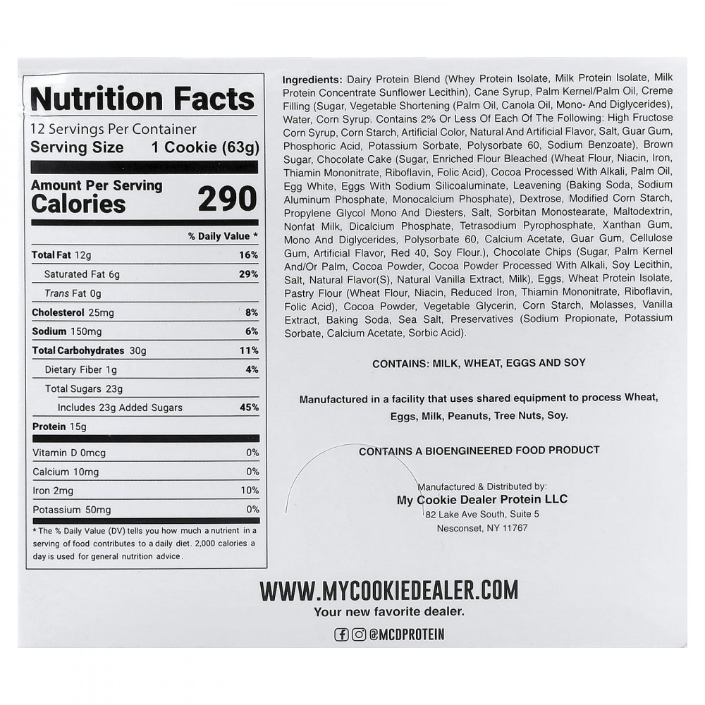 Смесь молочного протеина (изолят сывороточного протеина, изолят молочного протеина, концентрат молочного протеина, подсолнечный лецитин), тростниковый сироп, пальмоядровое масло/пальмовое масло, кремовая начинка (сахар, растительный жир (пальмовое масло, рапсовое масло, моно- и диглицериды), вода, кукурузного сиропа. содержит менее 2% следующих ингредиентов: кукурузный сироп с высоким содержанием фруктозы, кукурузный крахмал, искусственных красителей, натуральные и искусственные ароматизаторы, соль, гуаровая камедь, фосфорная кислота, сорбат калия, полисорбат 60, бензоат натрия), коричневый сахар, шоколадный торт (сахар, обогащенная отбеленная мука (пшеничная мука, ниацин, железа, мононитрат тиамина, рибофлавин, фолиевая кислота), обработанное щелочью какао, пальмовое масло, яичный белок, яйца с силикоалюминатом натрия, разрыхлитель (пищевая сода, фосфат натрия и алюминия, монокальций фосфат), декстроза, модифицированный кукурузный крахмал, моно- и диэфиры пропиленгликоля, соль, сорбитан моностеарат, мальтодекстрин, обезжиренное молоко, дикальций фосфат, пирофосфат тетранатрия, ксантановая камедь, моно- и диглицериды, полисорбат 60, ацетат кальция, гуаровая камедь, целлюлозная камедь, искусственных ароматизаторов, краситель красный 40, соевая мука)., шоколадная крошка (сахар, пальмового ядра и/или пальмового, какао-порошок, какао-порошок, обработанный щелочью, соевый лецитин, соль, натуральные ароматизаторы, натуральный экстракт ванили, молоко), яиц, изолят белка пшеницы, мука для печенья (пшеничная мука, ниацин, восстановленное железо, мононитрат тиамина, рибофлавин, фолиевая кислота), какао-порошок, растительный глицерин, кукурузный крахмал, патока, экстракт ванили, пищевая сода, морская соль, консервантов (пропионат натрия, сорбат калия, ацетат кальция, сорбиновую кислоту).