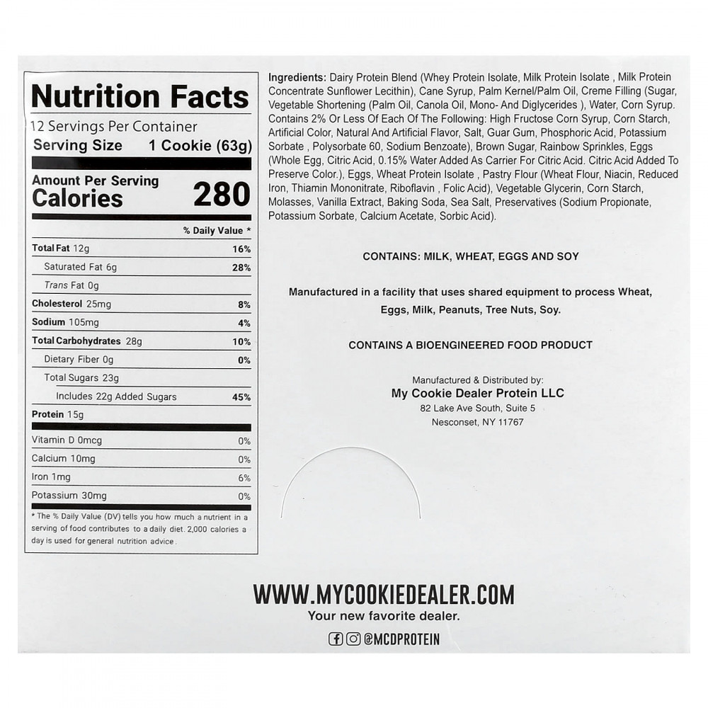 Смесь молочного протеина (изолят сывороточного протеина, изолят молочного протеина, концентрат молочного протеина, подсолнечный лецитин), тростниковый сироп, пальмоядровое масло/пальмовое масло, кремовая начинка (сахар, растительный жир (пальмовое масло, рапсовое масло, моно- и диглицериды), вода, кукурузный сироп, содержит менее 2% следующих ингредиентов: кукурузный сироп с высоким содержанием фруктозы, кукурузный крахмал, искусственных красителей, натуральные и искусственные ароматизаторы, соль, гуаровая камедь, фосфорная кислота, сорбат калия, полисорбат 60, бензоат натрия), коричневый сахар, радужная посыпка, яйца (цельное яйцо, лимонная кислота, в качестве основы для лимонной кислоты добавлено 0,15% воды. лимонная кислота добавлена для сохранения цвета)., яиц, изолят белка пшеницы, мука для печенья (пшеничная мука, ниацин, восстановленное железо, мононитрат тиамина, рибофлавин, фолиевая кислота), растительный глицерин, кукурузный крахмал, патока, экстракт ванили, пищевая сода, морская соль, консервантов (пропионат натрия, сорбат калия, ацетат кальция, сорбиновую кислоту).