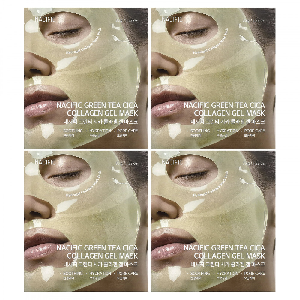 Гидрогелевая маска премиального качества, обогащенная водорастворимым коллагеном, экстрактом зеленого чая и комплексом цики, успокаивает кожу, увлажняет ее, повышает чистоту и сияние.