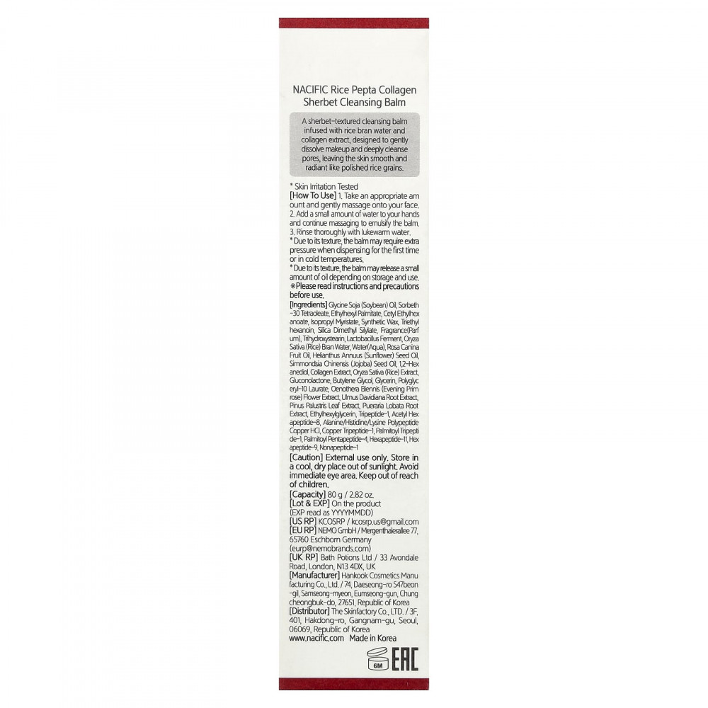 Соевое масло (Glycine soja), сорбет-30 тетраолеат, этилгексил пальмитат, цетилэтилгексаноат, изопропил миристат, синтетический воск, триэтилгексаноин, диметилсилат диоксида кремния, отдушка (парфюмерная композиция), тригидроксистеарин, Фермент лактобактерий, вода из рисовых отрубей (Oryza sativa), вода (Aqua), масло шиповника (Rosa canina), Масло семян подсолнечника, Масло семян Simmondsia chinensis (Jojoba), 1,2-гександиол, экстракт коллагена, экстракт риса (Oryza sativa), Глюконолактон, бутиленгликоль, глицерин, полиглицерил-10 лаурат, экстракт цветков примулы вечерней (Oenothera biennis), экстракт корня вяза Давида (Ulmus davidiana), экстракт хвои сосны болотной (Pinus palustris), экстракт корней пуэрарии дольчатой (Pueraria lobata), этилгексилглицерин, трипептид-1, ацетил гексапептид-8, полипептид меди гидрохлорида аланина/гистидина/лизина, трипептид меди-1, пальмитоил трипептид-1, пальмитоил пентапептид-4, гексапептид-11, гексапептид-9, нонапептид-1.