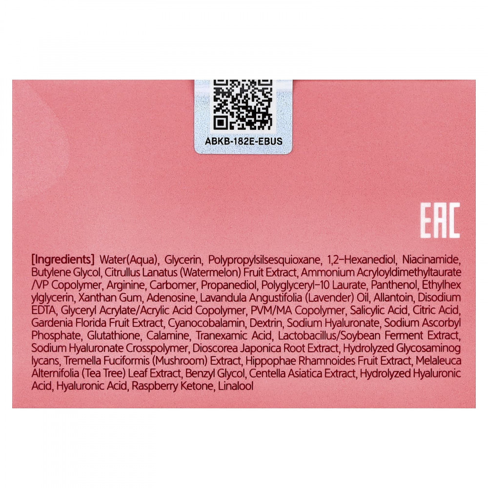 Вода, глицерин, полипропилсилсесквиоксан, 1,2-гександиол, никотинамид, бутиленгликоль, экстракт арбуза (Citrullus lanatus), аммоний акрилоилдиметилтаурат/ВП сополимер, аргинин, карбомер, пропандиол, полиглицерил-10 лаурат, пантенол, этилгексилглицерин, ксантановая камедь, аденозин, лавандовое масло (Lavandula angustifolia), аллантоин, двунатриевая ЭДТК, сополимер глицерил акрилата/акриловой кислоты, ПВМ/МА сополимер, салициловая кислота, лимонная кислота, экстракт плодов гардении жасминовидной (Gardenia florida), цианокобаламин, декстрин, гиалуронат натрия, аскорбил фосфат натрия, глутатион, каламин, транексамовая кислота, лактобактерии (Lactobacillus) /ферментированный экстракт соевых бобов, кроссполимер гиалуроната натрия, экстракт корня диоскореи японской (Dioscorea japonica), гидролизованные гликозаминоликаны, экстракт снежного гриба (Tremella fuciformis), экстракт плодов облепихи крушиновидной (Hippophae rhamnoides), экстракт листьев чайного дерева (Melaleuca alternifolia), бензилгликоль, экстракт готу колы (Centella asiatica), гидролизованная гиалуроновая кислота, гиалуроновая кислота, малиновый кетон, линалоола.
