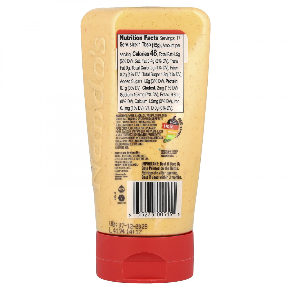 Вода, рапсовое масло, уксус, сахара, кукурузный крахмал, соль, яичный желток, специи (африканский птичий глаз, кайенский перец, паприка, горчичная мука, черный перец, белый перец), лимонное пюре, луковое пюре, зеленый перец, чесночное пюре, гуаровая камедь, ксантановая камедь, альгинат пропиленгликоля (полученный из морских водорослей), консервант (сорбат калия), антиоксиданты (аскорбиновая кислота, экстракт розмарина, динатрия кальция (эдта) краситель (олезорезины паприки).