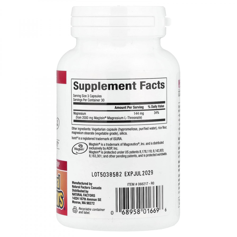 | Магний (из 2000 мг L-треоната магния Magtein®) | 144 мг | 34% |