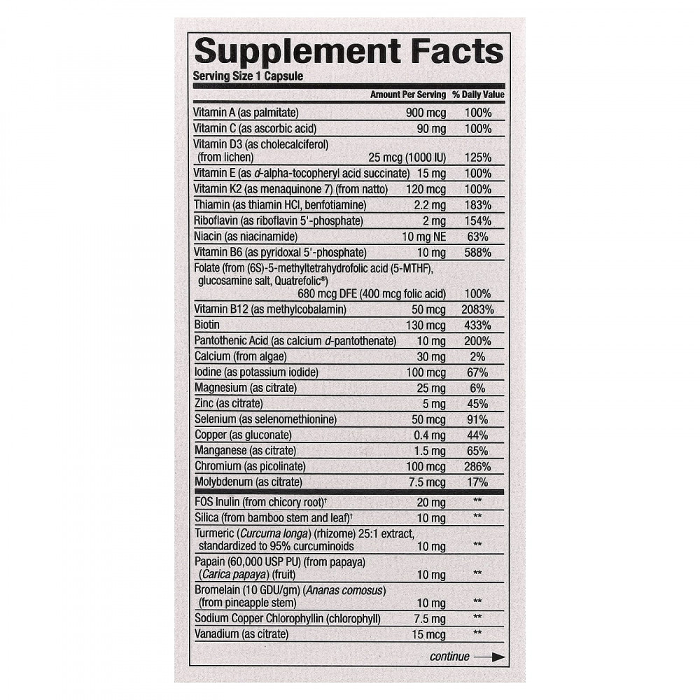 | ‡ Каждая капсула содержит концентраты 3000 мг смеси органических овощей свежего урожая и / или смеси органических фруктов. Люцерна, артишок, руккола, ячмень, свекла, брокколи, капуста, цветная капуста, сельдерей, кориандр, капуста, петрушка, перец чили, редис, томат, кресс-салат, морковь, базилик, мангольд, одуванчик, календула, асаи, черника, голубика, клюква , Яблоко, малина, клубника | 200 мг | ** |
