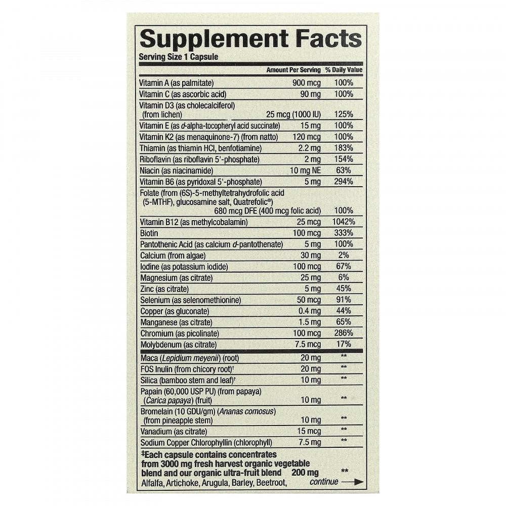 | ‡ Каждая капсула содержит концентраты 3000 мг смеси органических овощей свежего урожая и / или смеси органических фруктов. Люцерна, артишок, руккола, ячмень, свекла, брокколи, капуста, цветная капуста, сельдерей, кориандр, капуста, петрушка, перец чили, редис, томат, кресс-салат, морковь, базилик, мангольд, одуванчик, календула, асаи, черника, голубика, клюква , Яблоко, малина, клубника | 200 мг | ** |