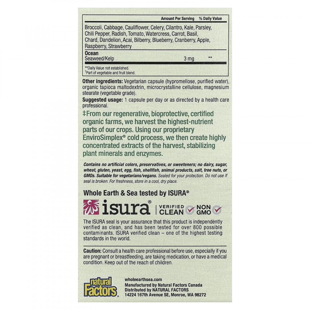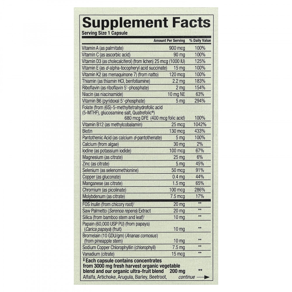 | ‡ Каждая капсула содержит концентраты 3000 мг смеси органических овощей свежего урожая и / или смеси органических фруктов. Люцерна, артишок, руккола, ячмень, свекла, брокколи, капуста, цветная капуста, сельдерей, кориандр, капуста, петрушка, перец чили, редис, томат, кресс-салат, морковь, базилик, мангольд, одуванчик, календула, асаи, черника, голубика, клюква , Яблоко, малина, клубника | 200 мг | ** |