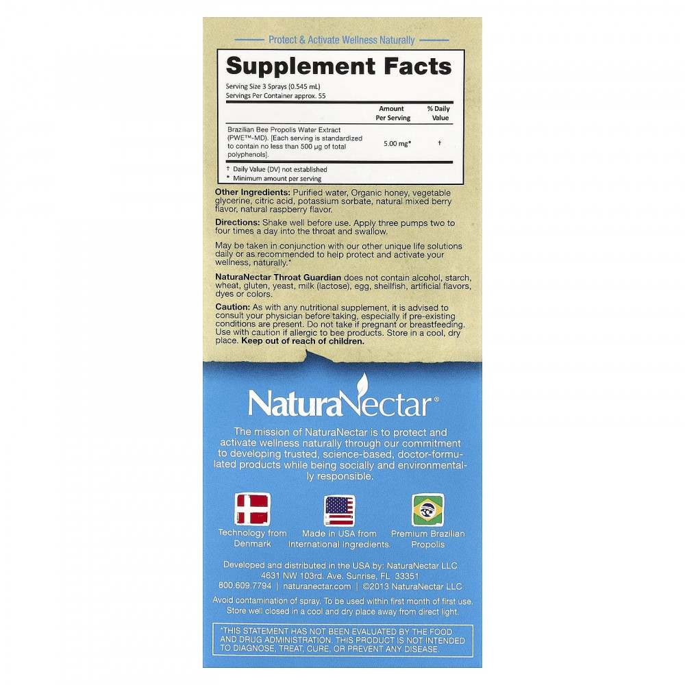 Средство Throat Guardian от NaturaNectar не содержит спирта, крахмал, пшеницы, глютена, дрожжей, молока (лактозы), яиц, моллюсков, искусственных ароматизаторов, красителей.