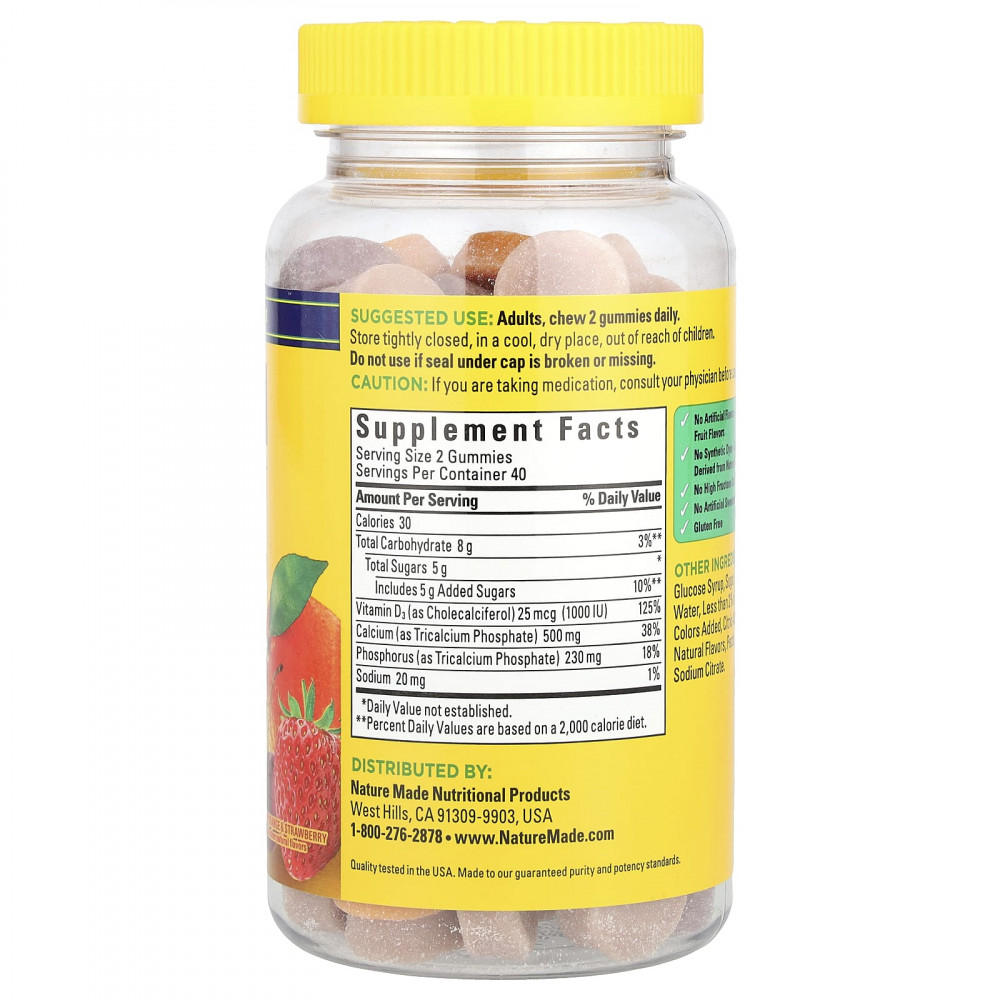 Кальций и витамин D помогают поддерживать здоровье костей и зубов, а витамин D помогает улучшить усвоение кальция. Одна порция жевательных таблеток с кальцием от Nature Made® содержит 500 мг кальция и 25 мкг (700 МЕ) витамина D3, которые помогут удовлетворить вашу ежедневную потребность в кальции в двух жевательных таблетках с фруктовым вкусом. Достаточное количество кальция в рационе в течение всей жизни может снизить риск развития остеопороза.