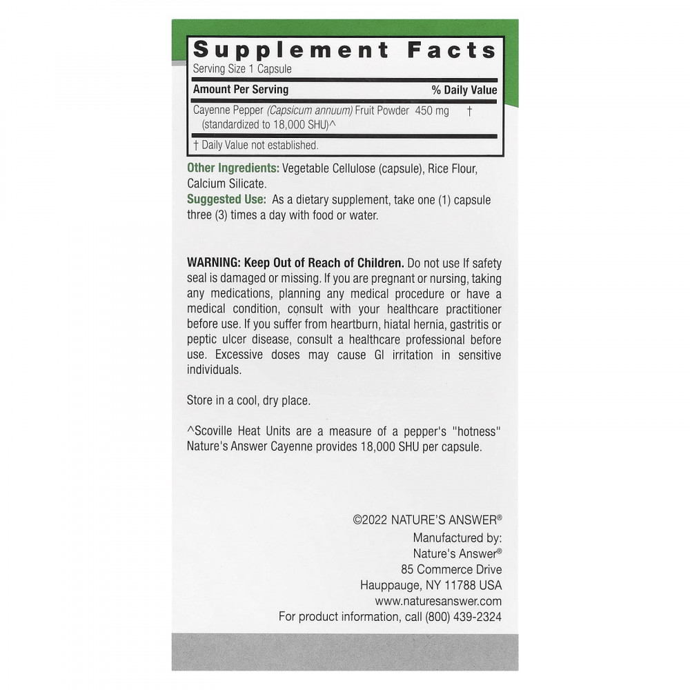 | † Суточная норма не определена ^ Единицы тепла по Сковиллу - это мера «остроты» перца. Nature's Answer Cayenne содержит 18 000 SHU на капсулу. | ||