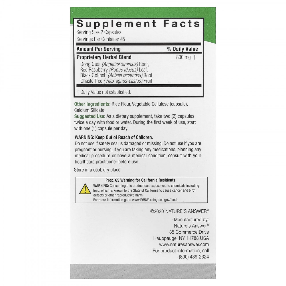 | Запатентованная травяная смесь корень дягиля лекарственного (Angelica sinensis), листья малины (Rubus idaeus), корень воронца кистевидного (Actaea racemosa), плоды витекса (Vitex agnus-castus) | 800 мг | † |