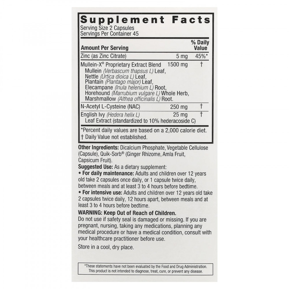 Капсулы для респираторной системы Mullein-X® содержат нашу травяную смесь, на патент которой подана заявка, разработанная для поддержки верхних дыхательной системы. Содержит NAC, который способствует разжижению слизи и укрепляет здоровье дыхательных путей, цинк для поддержки иммунной функции и английский плющ, который традиционно используется для комфорта дыхательной системы.