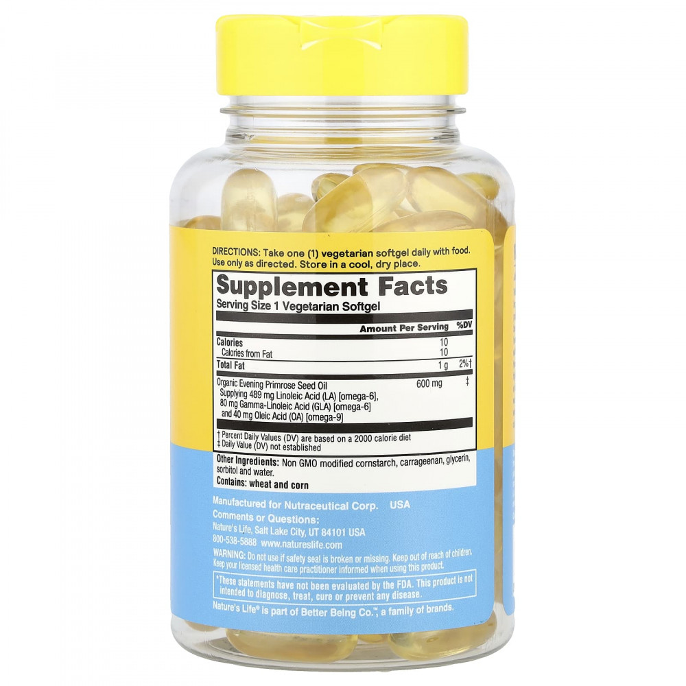 | Масло из семян органического первоцвета вечернего Содержит 489 мг линолевой кислоты (ЛК) [омега-6], 80 мг гамма-линоленовой кислоты (ГЛК) [омега-6] и 40 мг олеиновой кислоты (ОА) [омега-9] | 600 мг | ‡ |