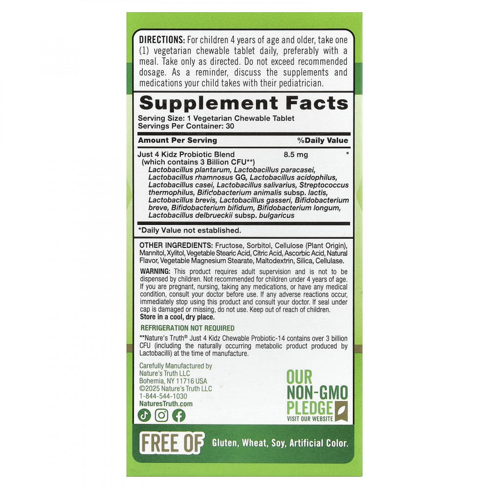 ** Жевательный пробиотик-14 Just 4 Kidz от Nature's Truth® содержит более 3 млрд КОЕ (включая продукт природного метаболизма лактобактерий) на момент производства.