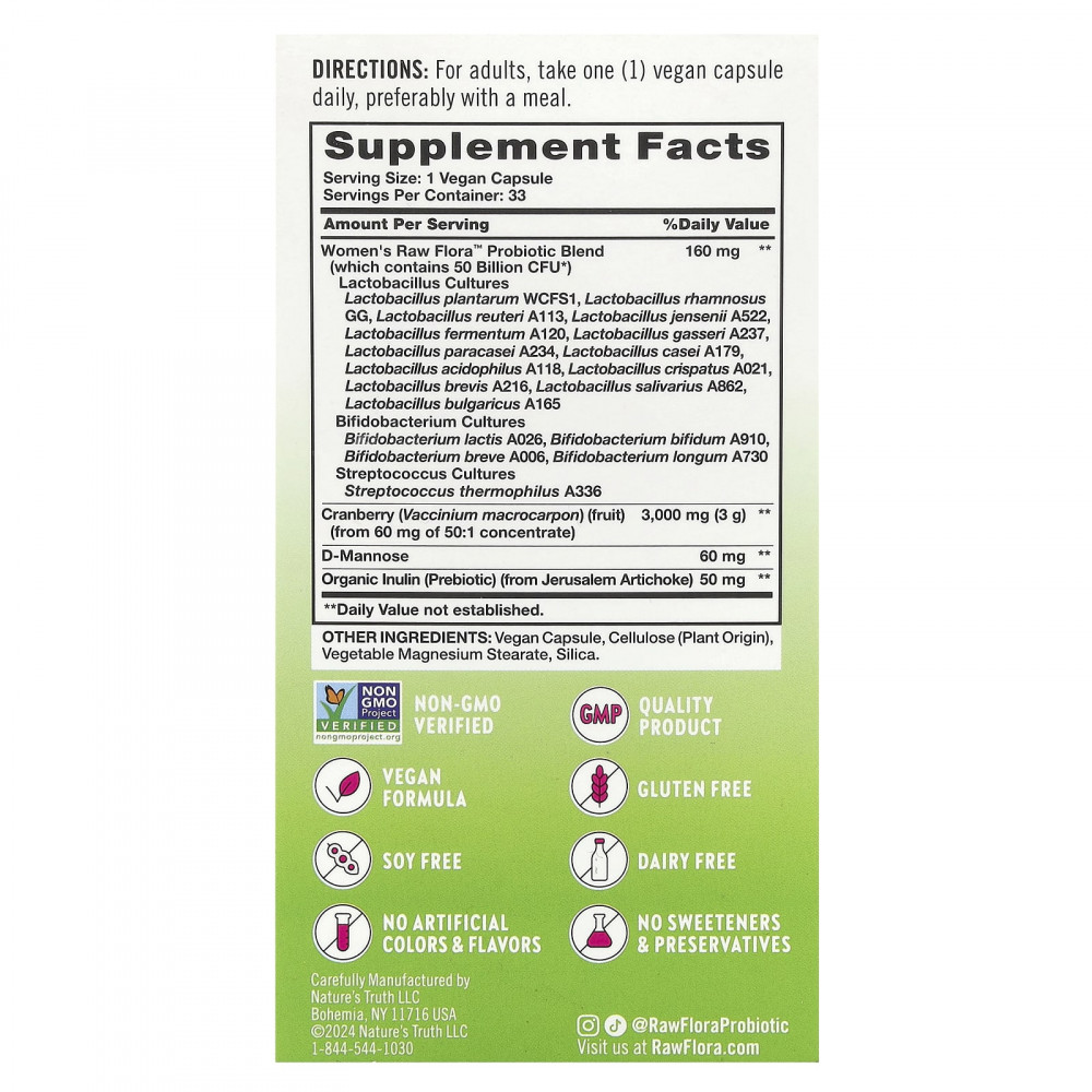 Women's Care Raw Flora ™ - это смесь пробиотиков премиального качества, разработанная врачом, чтобы предложить надежный источник высококачественных синергетических ингредиентов для удовлетворения уникальных потребностей женщин. Эта мощная комбинация содержит 50 миллиардов КОЕ (колониеобразующих единиц) восстанавливающих пробиотиков, обеспечивающих целенаправленную поддержку здоровья пищеварительной и влагалищной систем, и заслуживает доверия женщин благодаря своим мягким и эффективным свойствам *.