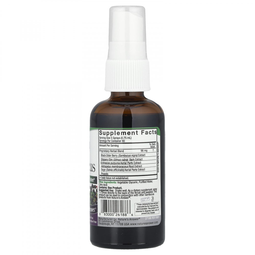 Хорошо встряхните перед использованием. В качестве пищевой добавки распылите 1–2 раза непосредственно на заднюю часть горла и проглотите. Этот продукт можно использовать вместе с другими продуктами Sambucus от Nature's Answer.