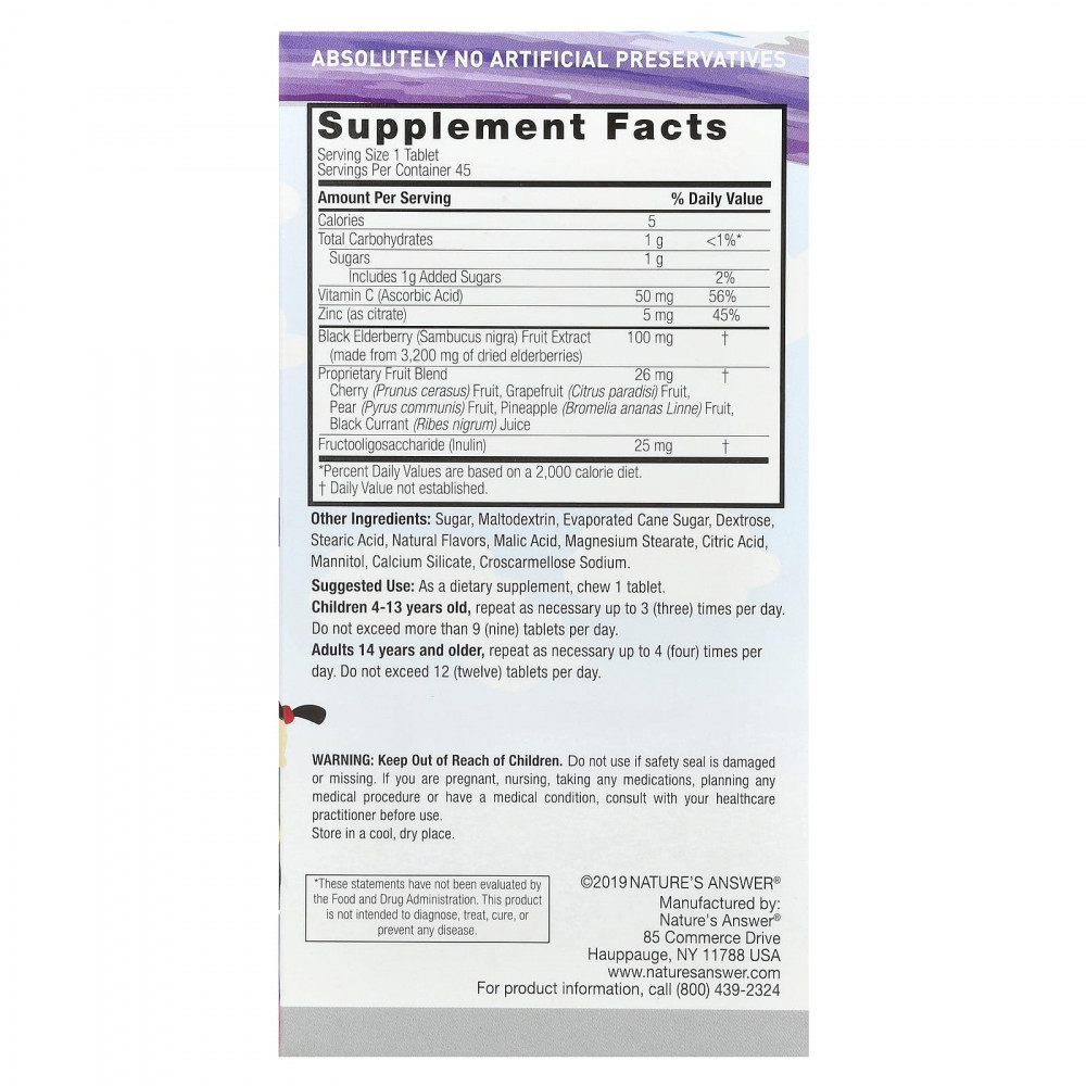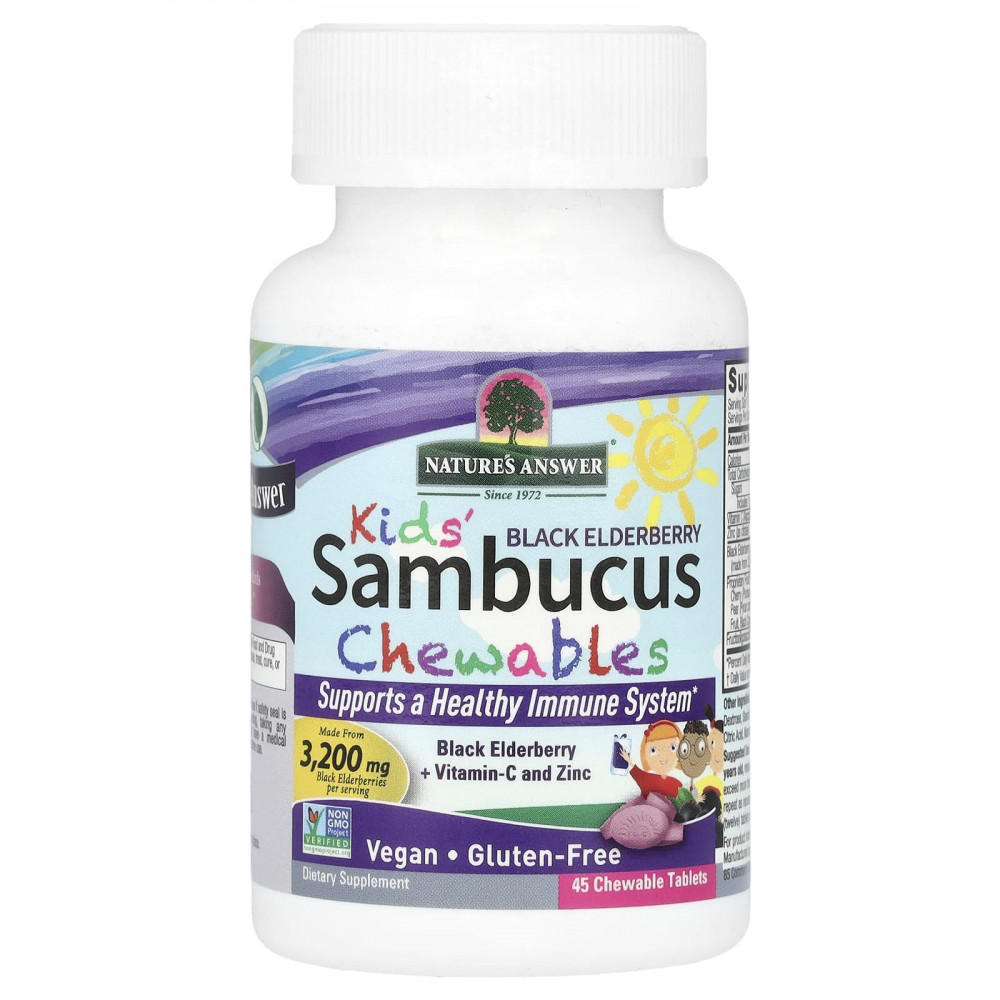 Жевательные таблетки Sambucus для детей от Nature's Answer содержат более 3200 мг черной бузины в 1 порции, которая содержит в два раза больше антиоксидантов, чем голубика, и больше антиоксидантов, чем клюква и ягоды годжи. Наши жевательные таблетки Sambucus содержат дополнительные полезные свойства витамина С и цинка. для поддержки здоровья иммунной системы. Эти жевательные таблетки с великолепным вкусом обладают мощным действием, способствующим ежедневной иммунной защите ваших детей.