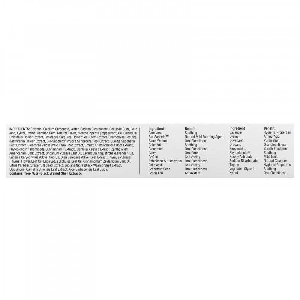 Глицерин, карбонат кальция, вода, бикарбонат натрия, целлюлозная камедь, фолиевая кислота, ксилитол, лизин, ксантановая камедь, натуральный ароматизатор, масло перечной мяты (Mentha piperita), экстракт цветков календулы (Calendula officinalis), экстракт цветков/листьев/стебля эхинацеи (Echinacea purpurea), экстракт цветков ромашки (Chamomilla recutita), Bio-Saponins® (экстракт корня юкки Шидигера (Yucca schidigera), экстракт корня килайи мыльной (Quillaja saponaria), экстракт корня дикого ямса (Dioscorea villosa), экстракт корня смилакса (Smilax aristolochiifolia)], Phytoplenolin® (экстракт травы австралийской ромашки (Centipeda cunninghamii), экстракт готу колы (Centella asiatica), экстракт коры сычуаньского перца (Zanthoxylum americanum), экстракт листьев орегано (Origanum vulgare), лавандовое масло (Lavandula angustifolia), масло из бутонов гвоздики (Eugenia caryophyllus), экстракт листьев оливкового дерева (Оlea europaea), масло из цветков/листьев тимьяна обыкновенного (Thymus vulgaris), масло из листьев эвкалипта шаровидного (Eucalyptus globulus), масло из коры корицы (Cinnamomum zeylanicum), экстракт семян грейпфрута (Citrus grandis), экстракт скорлупы черного ореха (Juglans nigra), убихинон (коэнзим Q10), экстракт листьев зеленого чая (Camellia sinensis), сок листьев алоэ вера (Aloe barbadensis).