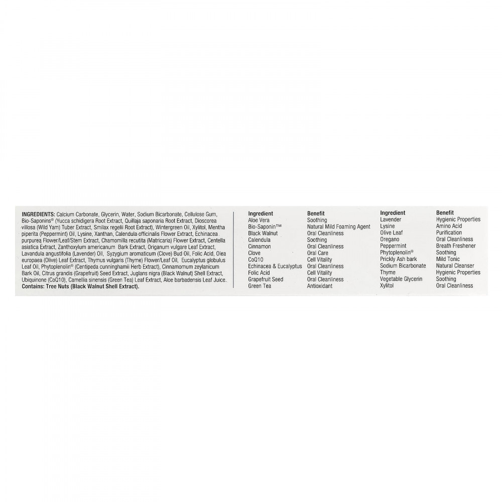 | Ингредиенты: Карбонат кальция, глицерин, вода, бикарбонат натрия, целлюлозная камедь, Bio-Saponins® (экстракт корня юкки Шидигера (Yucca schidigera), экстракт корня килайи (Quillaja saponaria), экстракт клубня дикого ямса (Dioscorea villosa), экстракт корня смилакса (Smilax regelii), масло грушанки, ксилитол, перечная мята (Mentha piperita) масло перечной мяты, лизин, ксантан, экстракт цветков календулы (Calendula officinalis), экстракт цветков/листьев/паров эхинацеи пурпурной (Echinacea purpurea), экстракт цветков ромашки (Chamomilla recutita), экстракт готу колы (Centella asiatica), экстракт коры сычуаньского перца (Zanthoxylum americanum), экстракт листьев орегано (Origanum vulgare), лаванда (Lavandula angustifolia) масло из бутонов гвоздики (Syzygium aromaticum), фолиевая кислота, экстракт листьев оливкового дерева (Olea europaea), масло из цветков и листьев чабреца (Thymus vulgaris), масло листьев эвкалипта шаровидного (Eucalyptus globulus), Phytoplenolin® (экстракт травы австралийской ромашки (Centipeda cunninghamii), масло из коры корицы (Cinnamomum zeylanicum), экстракт косточек грейпфрута (Citrus grandis), экстракт скорлупы черного ореха (Juglans nigra), убихинон (коэнзим Q10), экстракт листьев зеленого чая (Camellia sinensis), сок листьев алоэ вера (Aloe barbadensis). Содержит: древесные орехи (экстракт скорлупы черного ореха). | |
