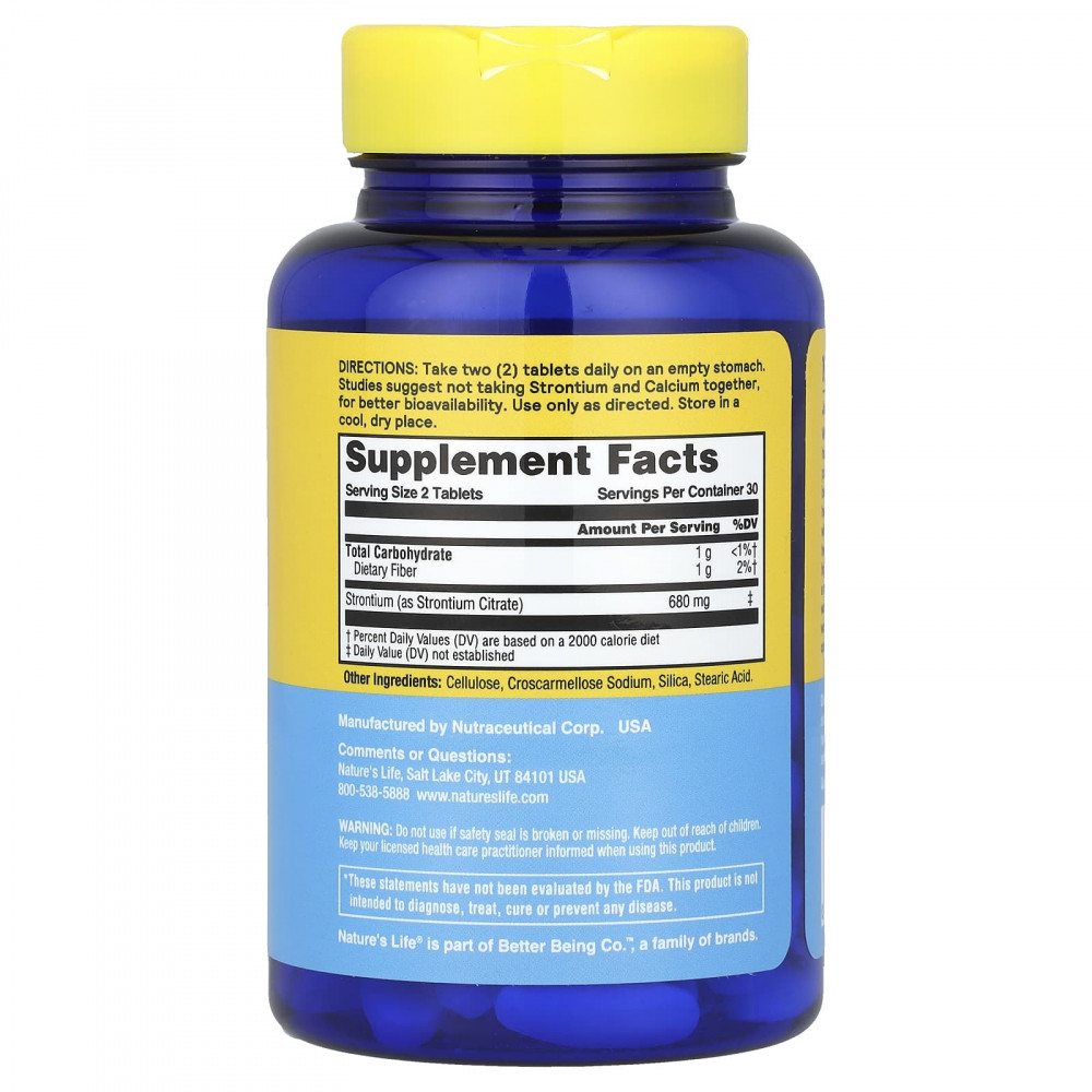 Стронций – природный минерал, присутствующий в воде и пище. Он похож по химическому составу на кальций и предназначен для обеспечения питательной поддержки здоровья костей.
