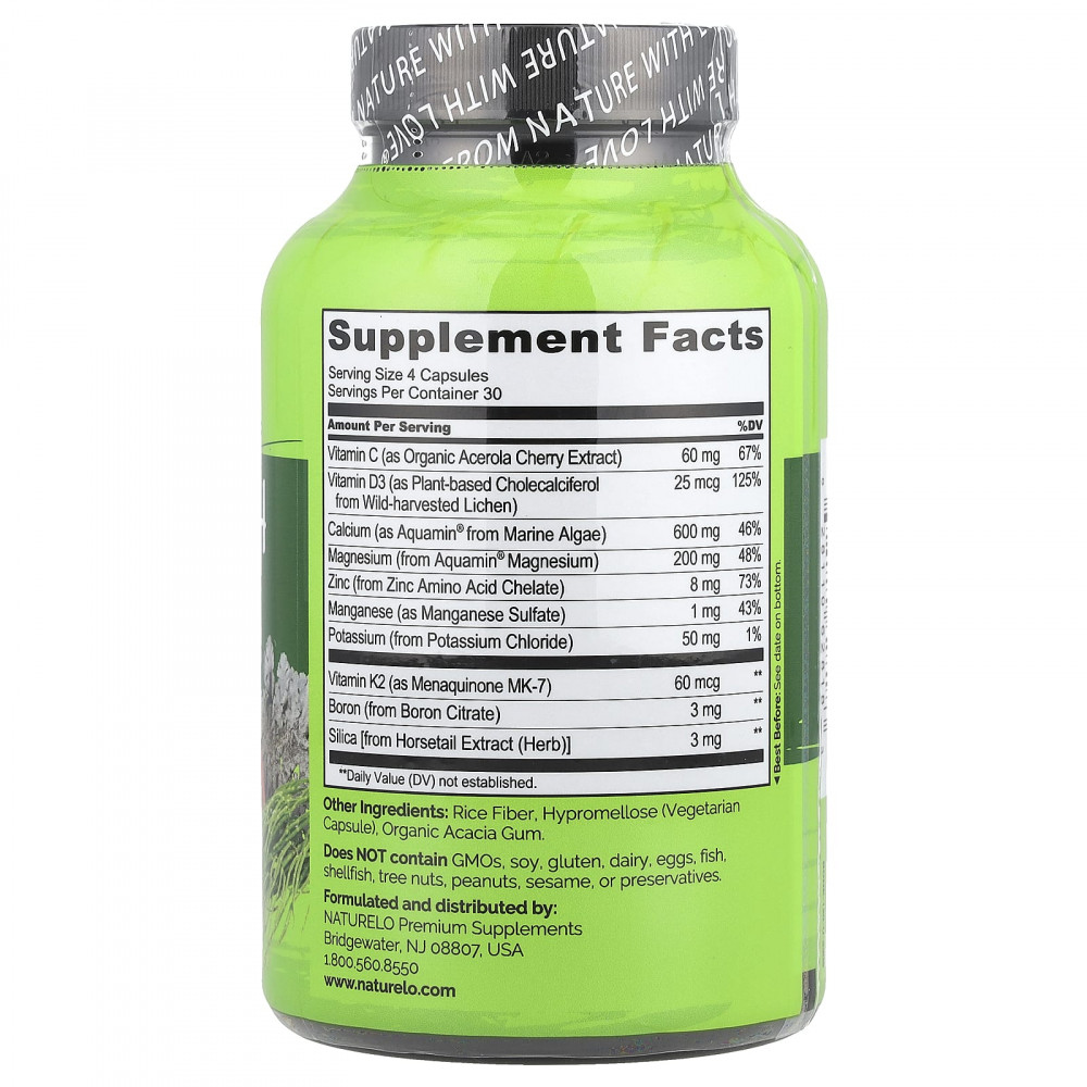 Растительные питательные вещества: содержит растительные питательные вещества из цельных продуктов для поддержки здоровья костей, включая кальций и магний из морских водорослей, витамин D3 из лишайников и витамин C из органического экстракта ацеролы.