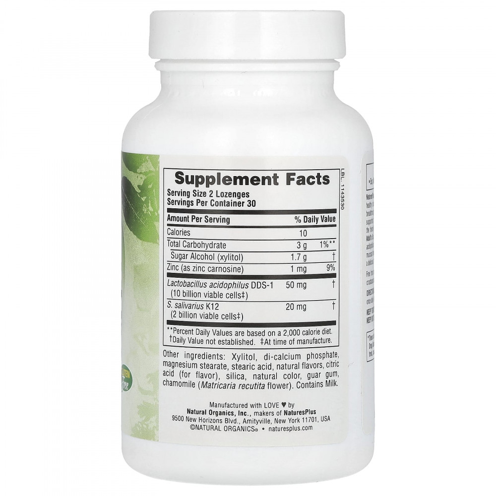 Таблетки для рассасывания для ушей, горла, носа для взрослых от NaturesPlus® способствуют формированию здоровой микрофлоры ушей, горла и носа благодаря революционному пробиотику K12! Помимо преимуществ для иммунной системы таблетки для рассасывания формируют здоровую микрофлору, способствующую здоровому, чистому и свежему дыханию. Таблетки для рассасывания для ушей, горла, носа для взрослых также содержат ацидофильные лактобактерии (Lactobacillus acidophilus) и карнозин цинка для здоровья желудочно-кишечного тракта и прочной слизистой оболочки. Таблетки для рассасывания для ушей, горла, носа обладают восхитительным натуральным вкусом вишни и ягод!