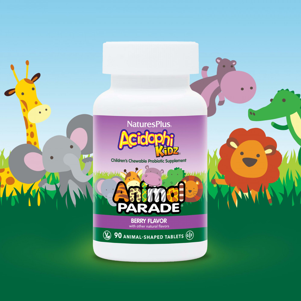 Дети не понимают, что такое пробиотики, пищеварение и то, что на самом деле происходит в их животах!Но родители знают, насколько важен правильный баланс пробиотиков для здоровья пищеварительной системы и общего состояния организма.Вот почему Animal Parade® AcidophiKidze содержит комплекс пробиотиков, содержащий пять штаммов пробиотиков, подходящих для детей, а также пребиотики, необходимые этим полезным бактериям для развития. Они имеют невероятный ягодный вкус и веселую форму, которые любят дети!