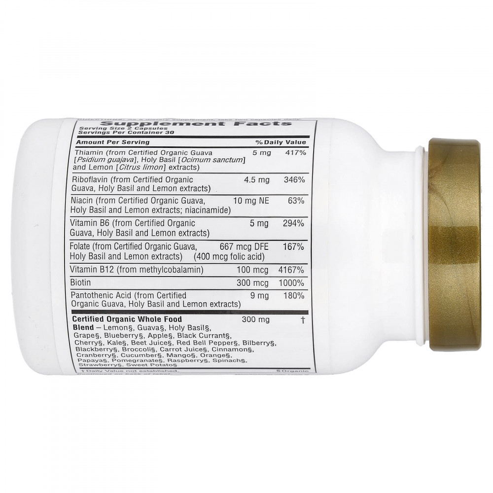 | Фолат (из сертифицированных экстрактов органических гуавы, базилика и лимона) | 667 мкг DFE (400 мкг фолиевой кислоты) | 167% |