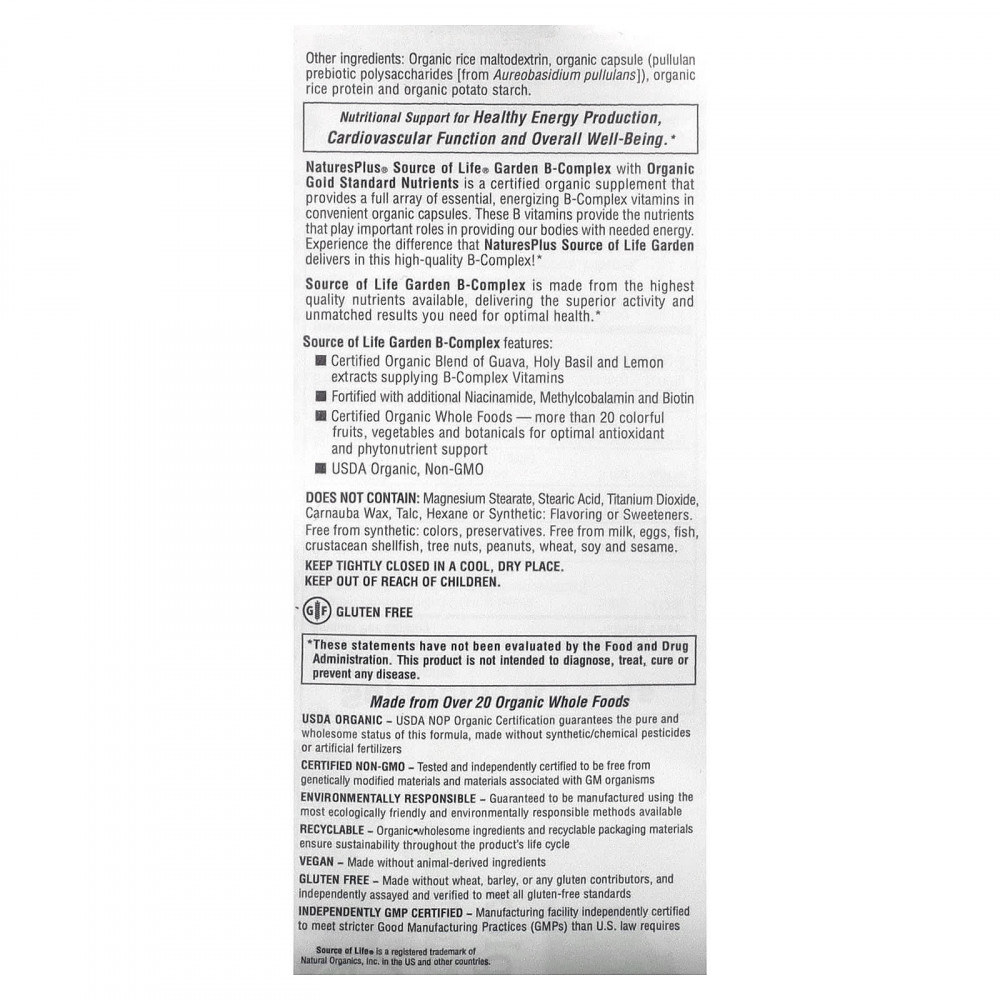 Комплекс витаминов группы B Source of Life® Garden от NaturesPlus® с органическими питательными веществами золотого стандарта качества — это сертифицированная органическая добавка, которая содержит полный набор необходимых, бодрящих витаминов группы B в виде удобных органических капсул. Эти витамины группы B обеспечивают питательные вещества, которые играют важную роль в снабжении нашего организма необходимой энергией. Почувствуйте разницу, которую дает Source of Life Garden от NaturesPlus в этом высококачественном комплексе витаминов группы B!