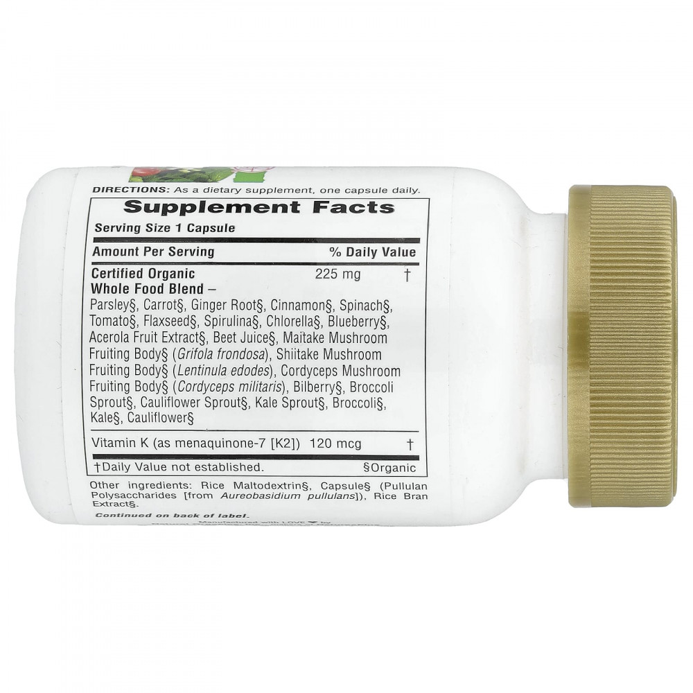 | Сертифицированная органическая цельнопищевая смесь: Петрушка§, морковь§, корень имбиря§ корица§, шпинат§, томат§, льняное семя§, спирулина§, хлорелла§, голубика§, экстракт плодов ацеролы§, свекольный сок§, плодовое тело гриба-барана§ (Grifola frondosa), шиитаке плодовое тело гриба§ (Lentinula edodes), плодовое тело гриба кордицепс§ (Cordyceps militaris), черника§, ростки брокколи§, ростки цветной капусты§, ростки кудрявой капусты§, брокколи§, кудрявая капуста§, цветная капуста§ | 225 мг | † |