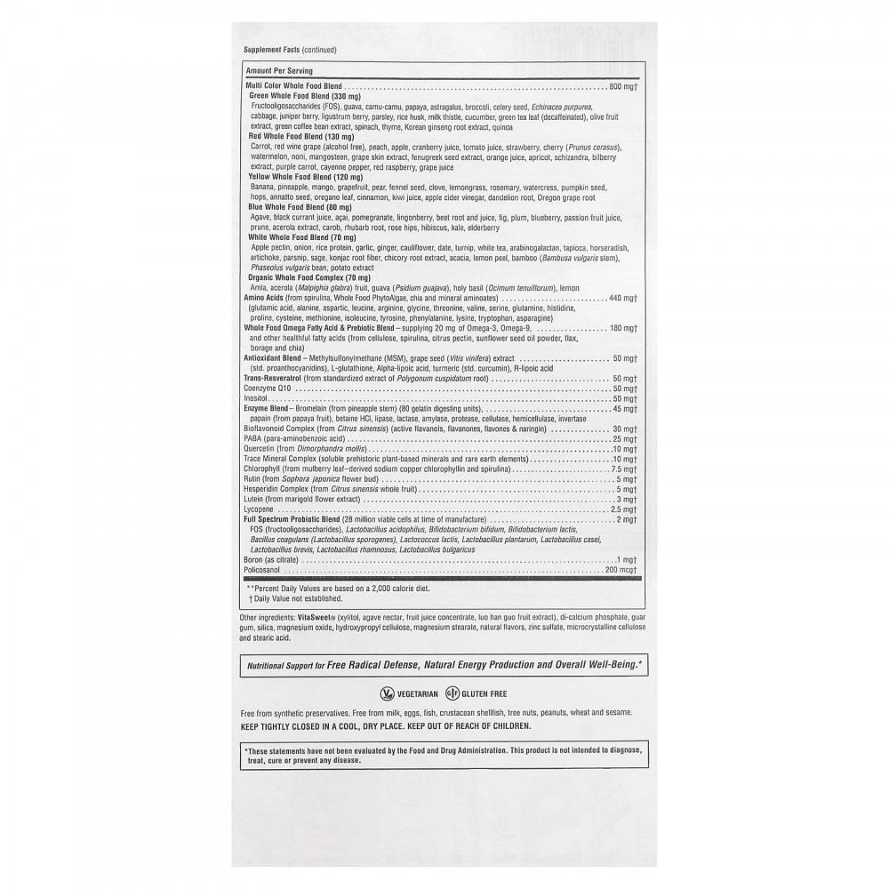 | Разноцветная цельнопищевая смесь смесь зеленых цельных продуктов (330 мг) Фруктоолигосахариды (ФОС), гуава, каму-каму, папайя, астрагал, брокколи, семена сельдерея, эхинацея пурпурная (Echinacea purpurea), капуста, ягоды можжевельника, ягоды лигуструма, петрушка, рисовая шелуха, расторопша, огурец, листья зеленого чая (без кофеина), плоды оливкового дерева экстракт, экстракт зеленых кофейных зерен, шпинат, чабрец, экстракт корня корейского женьшеня, киноа цельнопищевая смесь (130 мг) морковь, красный виноград (без спирта), персик, яблоко, клюквенный сок, томатный сок, клубника, вишня (Prunus cerasus), арбуз, нони, мангостан, экстракт кожуры винограда, экстракт семян пажитника, апельсиновый сок, абрикос, лимонник, черника экстракт, фиолетовая морковь, кайенский перец, красная малина, виноградный сок желтая цельнопищевая смесь (120 мг) Банан, ананас, манго, грейпфрут, груша, семена фенхеля, гвоздика, лемонграсс, розмарин, жерухи, семена тыквы, хмель, семена аннато, листья орегано, корица, сок киви, яблочный уксус, корень одуванчика, корень магонии падуболистной Blue Whole Food Blend (80 мг) Агава, сок черной смородины, ягоды асаи, гранат, брусника, корнеплод и сок свеклы, инжир, слива, голубика, сок маракуйи, чернослив, экстракт ацеролы, рожковое дерево, корень ревеня, плоды шиповника, гибискус, капуста кудрявая, бузина смесь цельных белков с белком (70 мг) Яблочный пектин, лук, рисовый белок, чеснок, имбирь, цветная капуста, финик, репа, белый чай, арабиногалактан, тапиока, хрен, артишок, пастернак, шалфей, клетчатка из корня конжака, экстракт корня цикория, акация, цедра лимона, бамбук (Bambusa vulgaris стебель), бобы Phaseolus vulgaris, экстракт картофеля комплекс органических цельных продуктов (70 мг) амла, плоды ацеролы (Malpighia glabra), гуава (Psidium guajava), базилик священный (Ocimum Tenuiflorum), лимон | 800 мг | † |