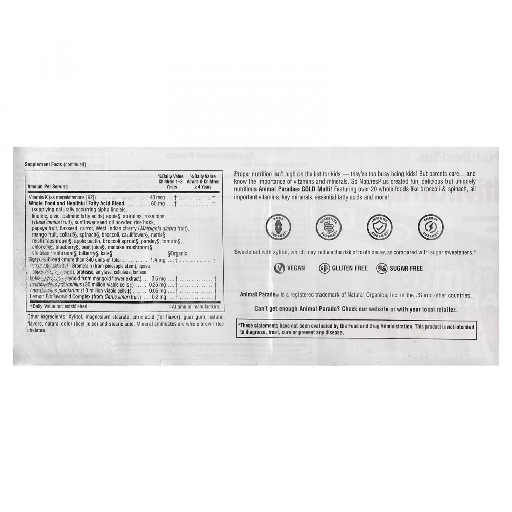 Дети не заботятся о правильном питании — они слишком заняты своими детскими делами. Но родители заботятся и знают о важности витаминов и минералов. Поэтому Natures Plus создала веселые, вкусные и питательные мультивитамины Animal Parade® GOLD Multi! Содержит более 20 цельных продуктов, таких как брокколи и шпинат, все важные витамины, ключевые минералы, незаменимые жирные кислоты и многое другое.