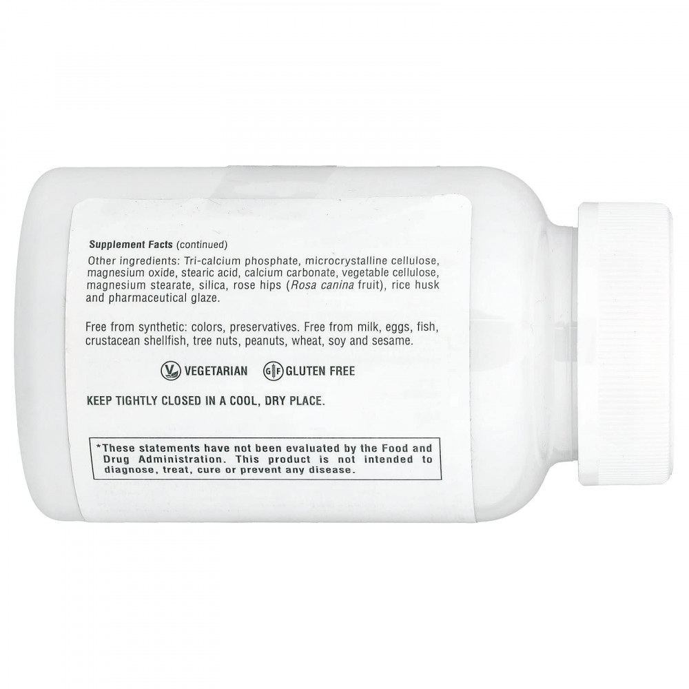 Трикальцийфосфат, микрокристаллическая целлюлоза, оксид магния, стеариновая кислота, карбонат кальция, растительная целлюлоза, стеарат магния, кремнезем, плоды шиповника (Rosa canina), рисовая шелуха и аптечная глазурь.