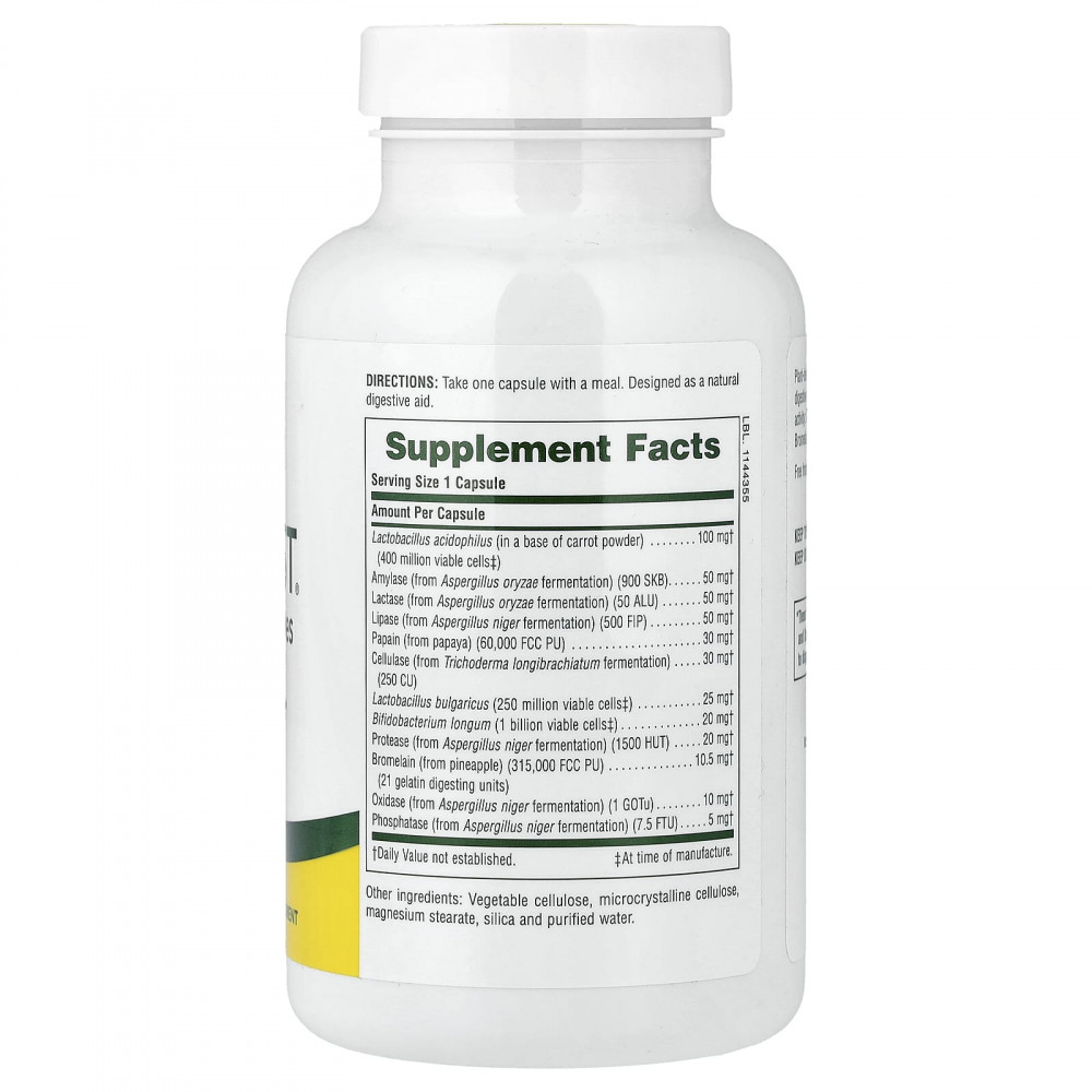 ферменты растительного происхождения и 3 пробиотика, способствующие здоровой функции пищеварения. Включает 9 эффективных ферментов для максимальной активности: амилаза, лактаза, липаза, папаин, целлюлаза, протеаза, бромелаин, оксидаза и фосфатаза.