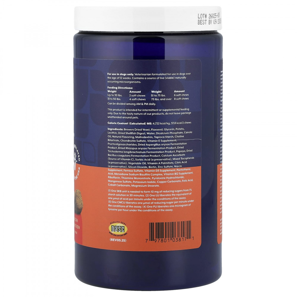 сухие пивные дрожжи, льняное семя, глицерин, картофеля, лецитин, переработанный продукт из сушеных моллюсков, вода, дикальций фосфат, рапсовое масло, натуральный ароматизатор, мальтодекстрин, тапиоковый крахмал, битартрат холина, хондроитин сульфат, добавка с витамином Е, фруктоолигосахариды, сухой продукт ферментации аспергилла (Aspergillus oryzae), сухой продукт ферментации ризопуса (Rhizopus oryzae), сухой продукт ферментации триходермы длиннолистой (Trichoderma longibrchiatum), папайя, сухой продукт ферментации бактерии бациллус коагуланс (B. coagulans), аскорбат кальция (источник витамина C), сорбиновая кислота (консервант), смешанные токоферолы (консервант), растительное масло, витамин A (пальмитат), лимонная кислота (консервант), диоксид кремния, биотин, сульфат цинка, добавка с ниацином, сульфат железа, добавка с витамином D3, пантотеновая кислота, комплекс менадиона с бисульфитом натрия, добавка с витамином B12, рибофлавин, тиамина мононитрат, пиридоксина гидрохлорид, сульфат марганца, йодид калия, карбонат меди, фолиевая кислота, карбонат кобальта, стеарат магния.