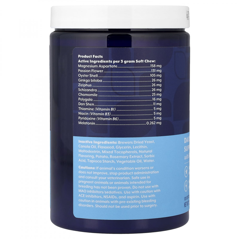 Разработано ветеринарами для собак в возрасте более 12 недель. Содержит растительные ингредиенты, которые способствуют эмоциональному равновесию. Содержит витамины группы B для поддержки спокойного поведения, смесь аспартата магния, пассифлоры и мелатонина, способствующие спокойному расслаблению, и ромашку для поддержки чувствительности желудка.