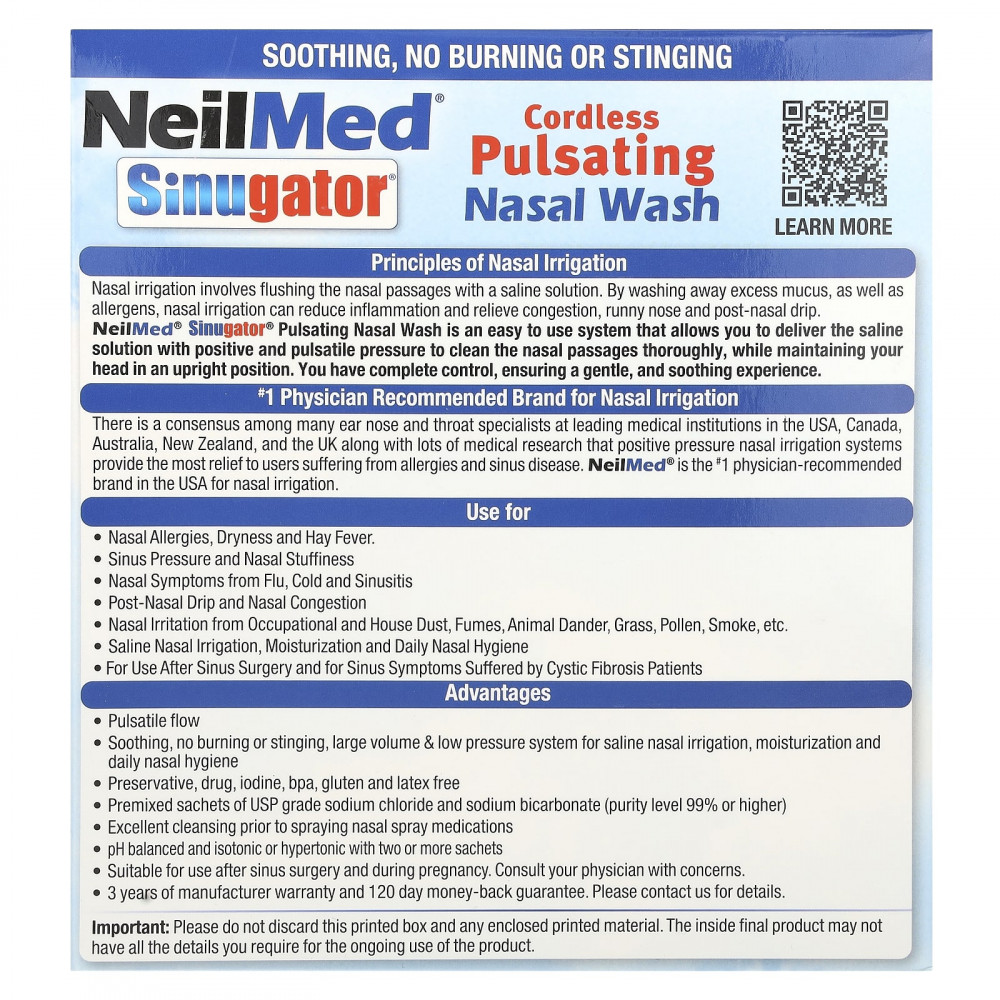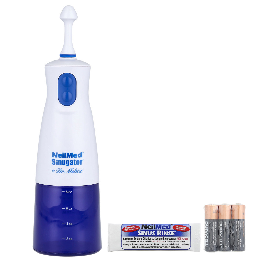 Орошение носа включает промывание носовых проходов солевым раствором. Вымывая лишнюю слизь, а также аллергены, орошение носа может уменьшить воспаление и облегчить заложенность носа, насморк и выделение носа из носа. Пульсирующий промывание носа NeilMed® Sinugator® — это простая в использовании система, которая позволяет подавать солевой раствор с импульсным давлением для тщательного очищения носовых проходов. Во время промывания не нужно наклонять голову. Вы полностью контролируете этот процесс, что обеспечивает мягкий и успокаивающий эффект.
