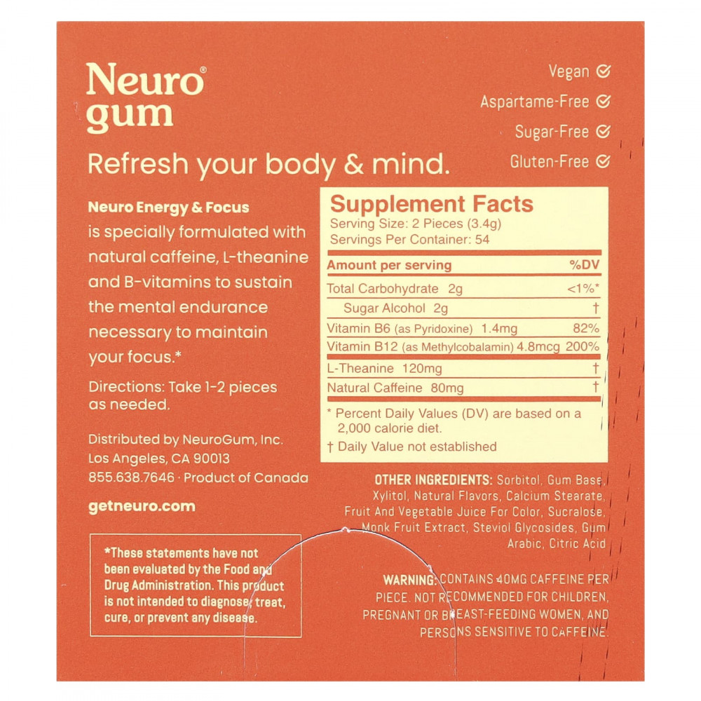 Neuro Energy & Focus содержит натуральный кофеин, L-теанин и витамины группы B, которые способствуют умственной выносливости, необходимой для сохранения концентрации внимания.