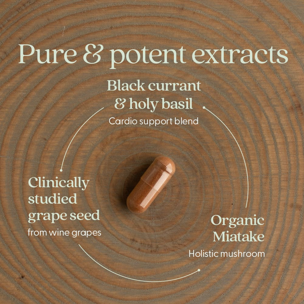 Идеальный состав: Смесь цельных трав полного спектра с клинически изученными виноградными косточками для здоровья сердца.