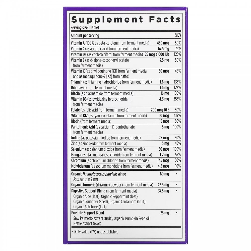 Продукт разработан экспертами для комплексной поддержки здоровья мужчин старше 55 лет. Содержит питательные вещества для поддержки здоровья мозга, костей, простаты, зрительной и пищеварительной системы, а также защиты от стресса. Комплекс витаминов дарит отличное настроение и поддерживает здоровье волос, кожи и ногтей. Не содержит железа.