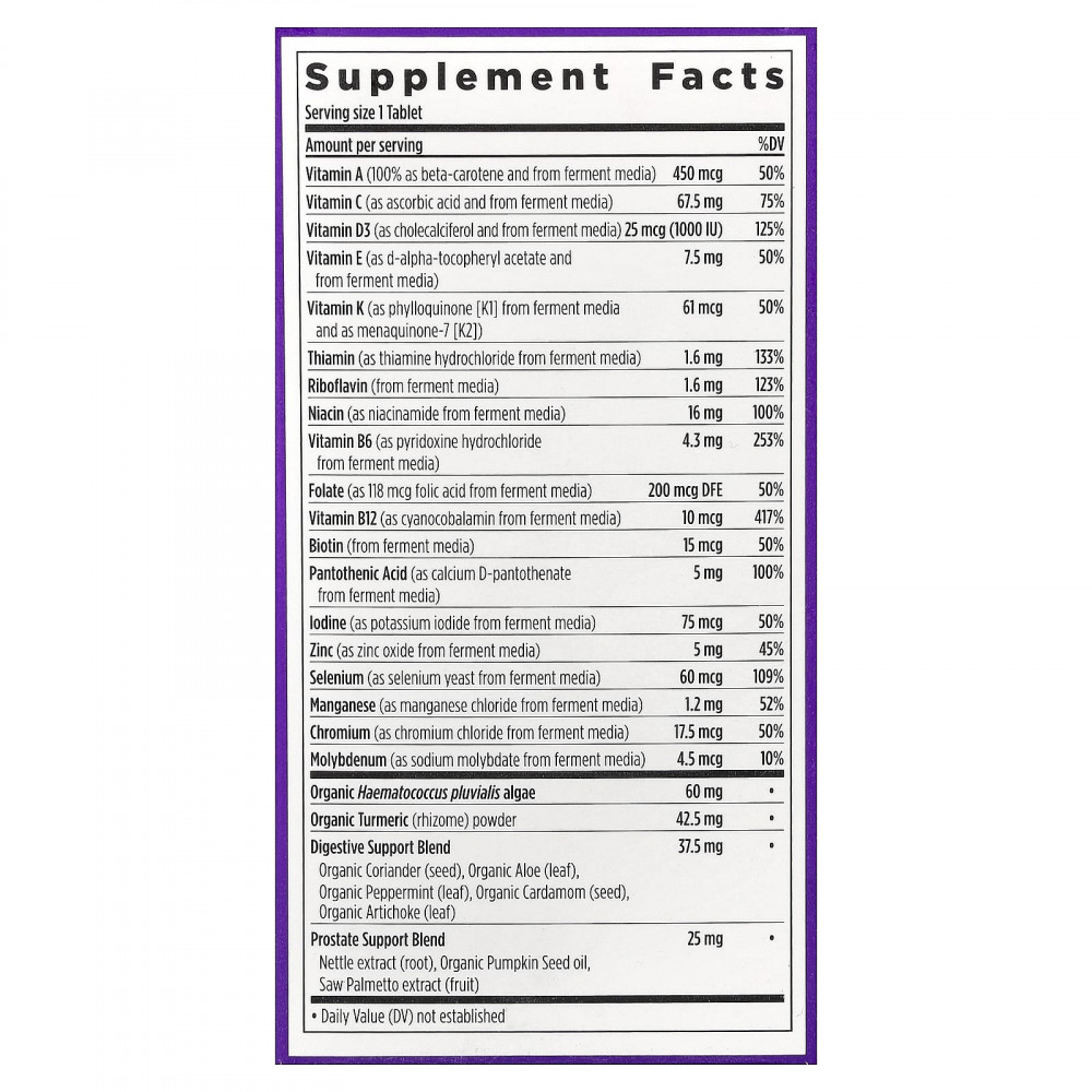 Разработано экспертами для комплексной поддержки здоровья мужчин старше 55 лет. Содержит питательные вещества для поддержки здоровья мозга, глаз, костей и простаты, защиты от стресса, улучшения настроения, зрения и пищеварения, а также для поддержки здоровья волос, кожи и ногтей. Не содержит железа.