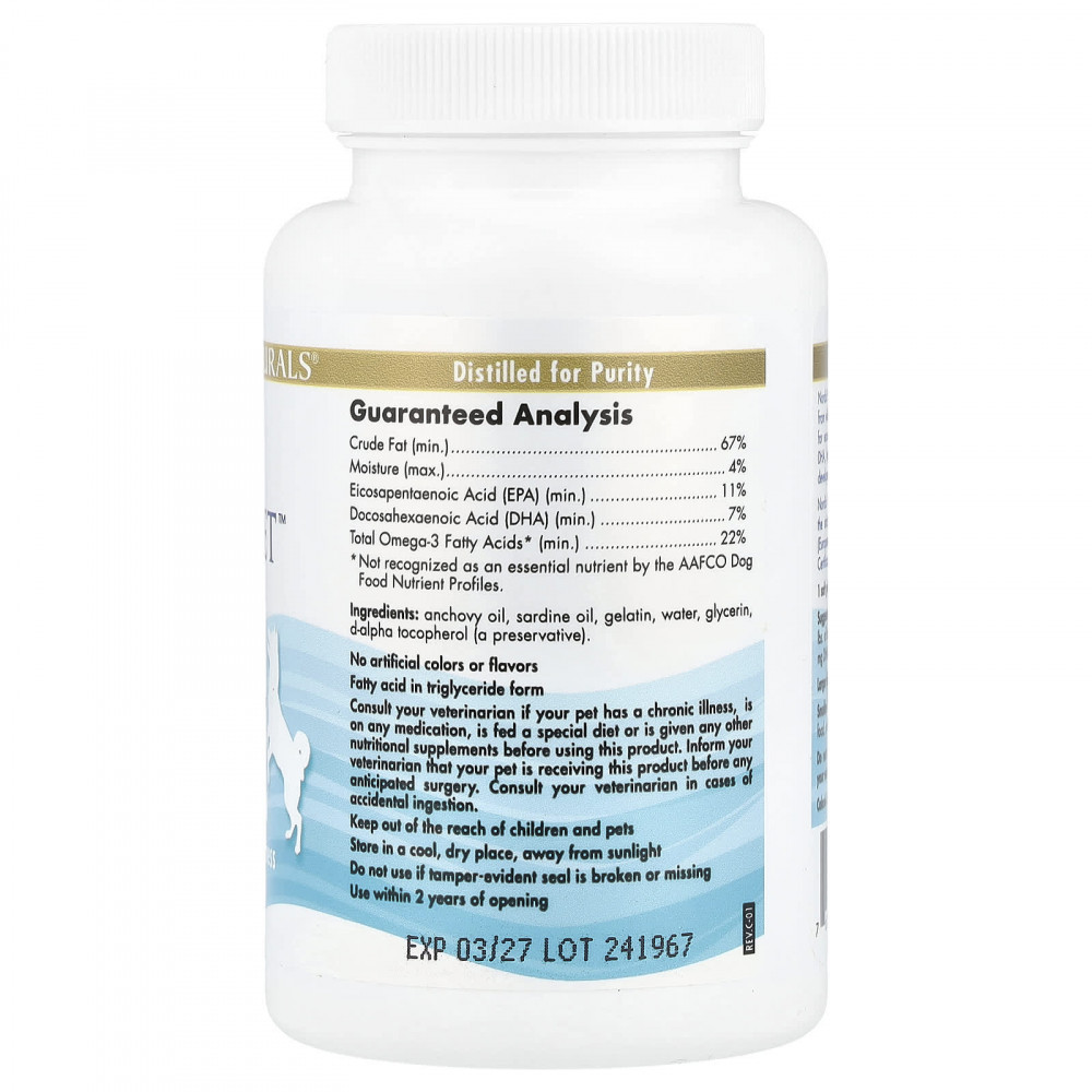 Ежедневное использование для собак. Используйте одну капсулу на каждые 9 кг (20 фунтов) веса тела. 1 капсула содержит 165 мг ЭПК / 105 мг ДГК / 330 мг омега-3 жирных кислот.