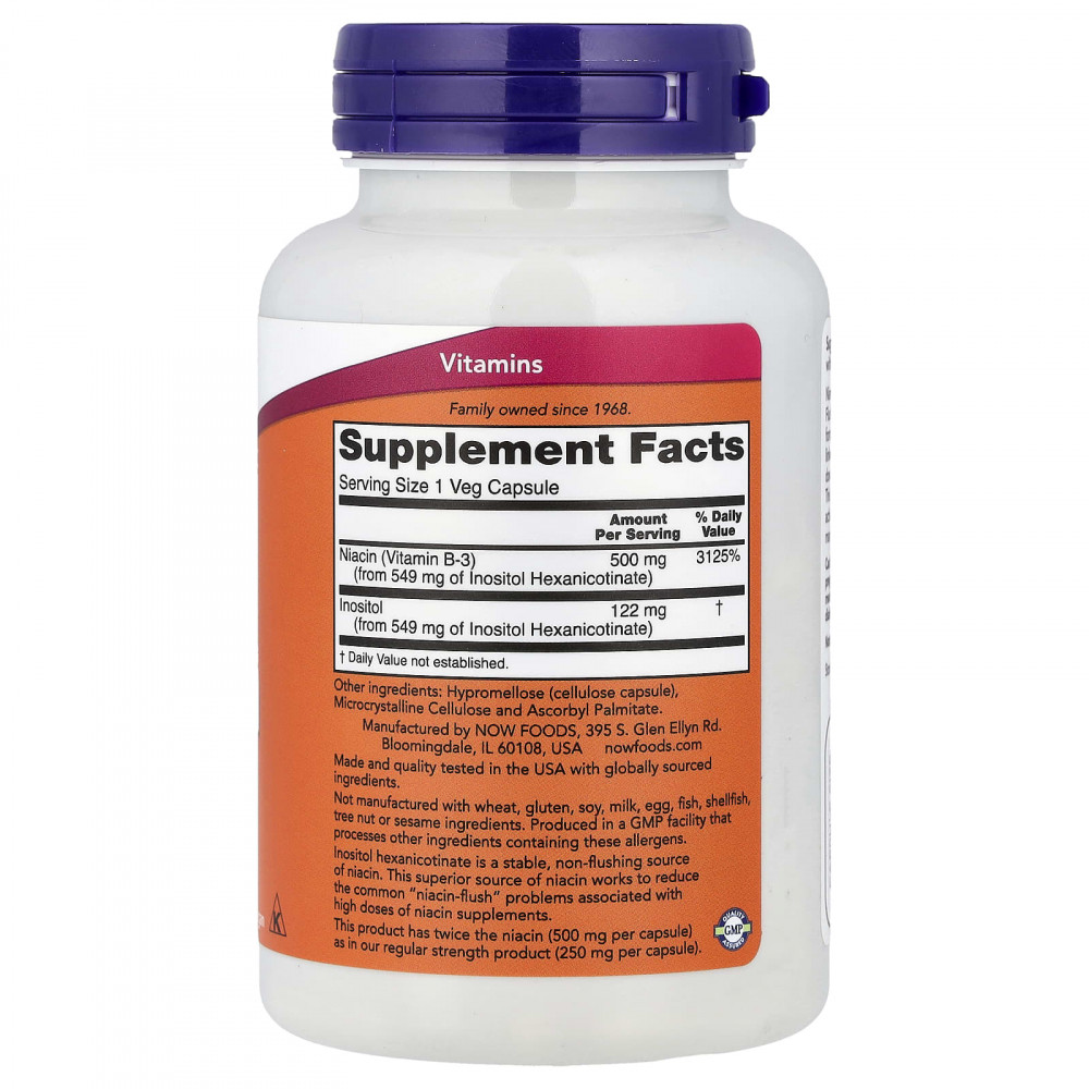 Ниацин (витамин B3) - незаменимый витамин группы B. Flush-Free Niacin содержит инозитол гексаникотинат - форму ниацина, состоящую из шести молекул ниацина, связанных с одной молекулой инозитола. Он медленно расщепляется в организме до свободного ниацина и инозитола. Это постепенное высвобождение ниацина обеспечивает истинную активность ниацина без характерных приливов, которые многие люди не переносят.