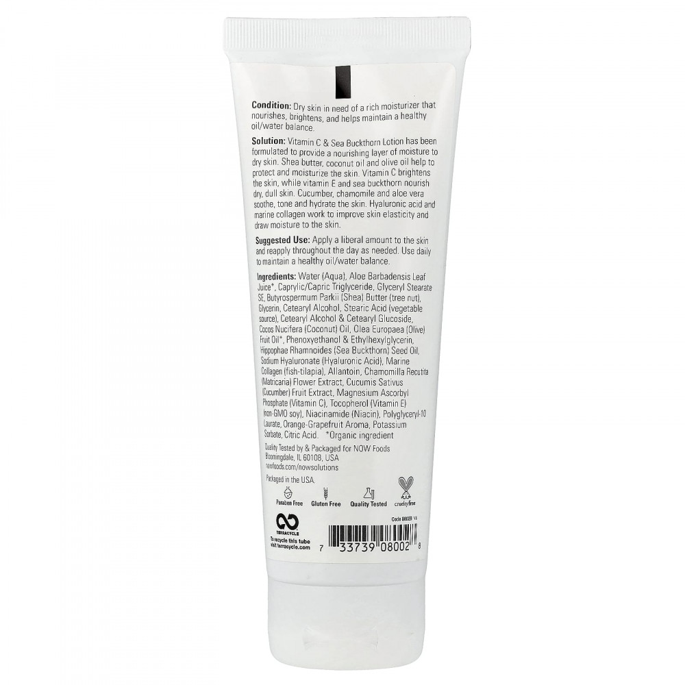 Решение. Лосьон с витамином C и облепихой создан, чтобы обеспечить увлажняющий и питание для сухой кожи. Масло ши, кокосовое и оливковое масла защищают и увлажняют кожу. Витамин С осветляет, а витамин Е и облепиха питают сухую тусклую кожу. Огурец, ромашка и алоэ вера успокаивают, тонизируют и увлажняют кожу. Гиалуроновая кислота и морской коллаген повышают эластичность и увлажняют.