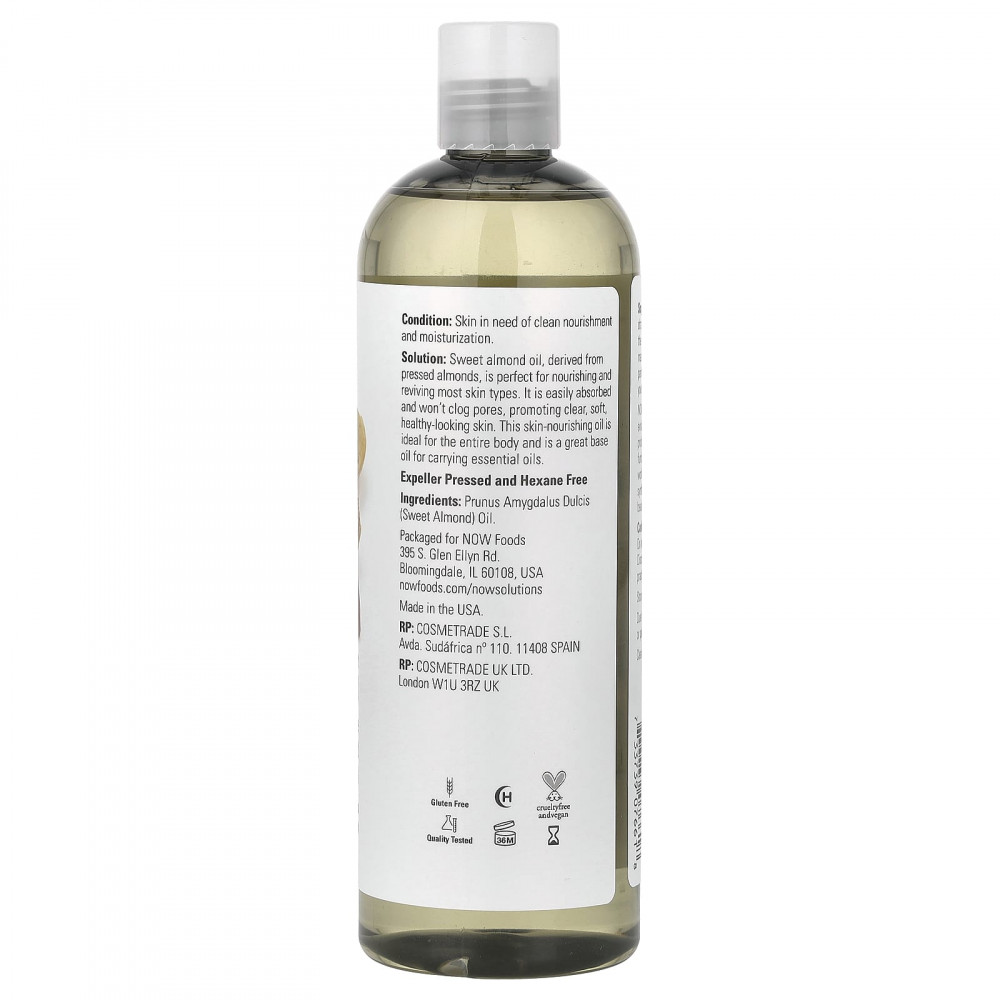 Решение: Масло сладкого миндаля, полученное из прессованного миндаля, идеально подходит для питания и восстановления большинства типов кожи. Он легко впитывается и не забивает поры, делая кожу чистой, мягкой и здоровой. Это питательное масло идеально подходит для всего тела и является отличной базой для добавления эфирных масел.