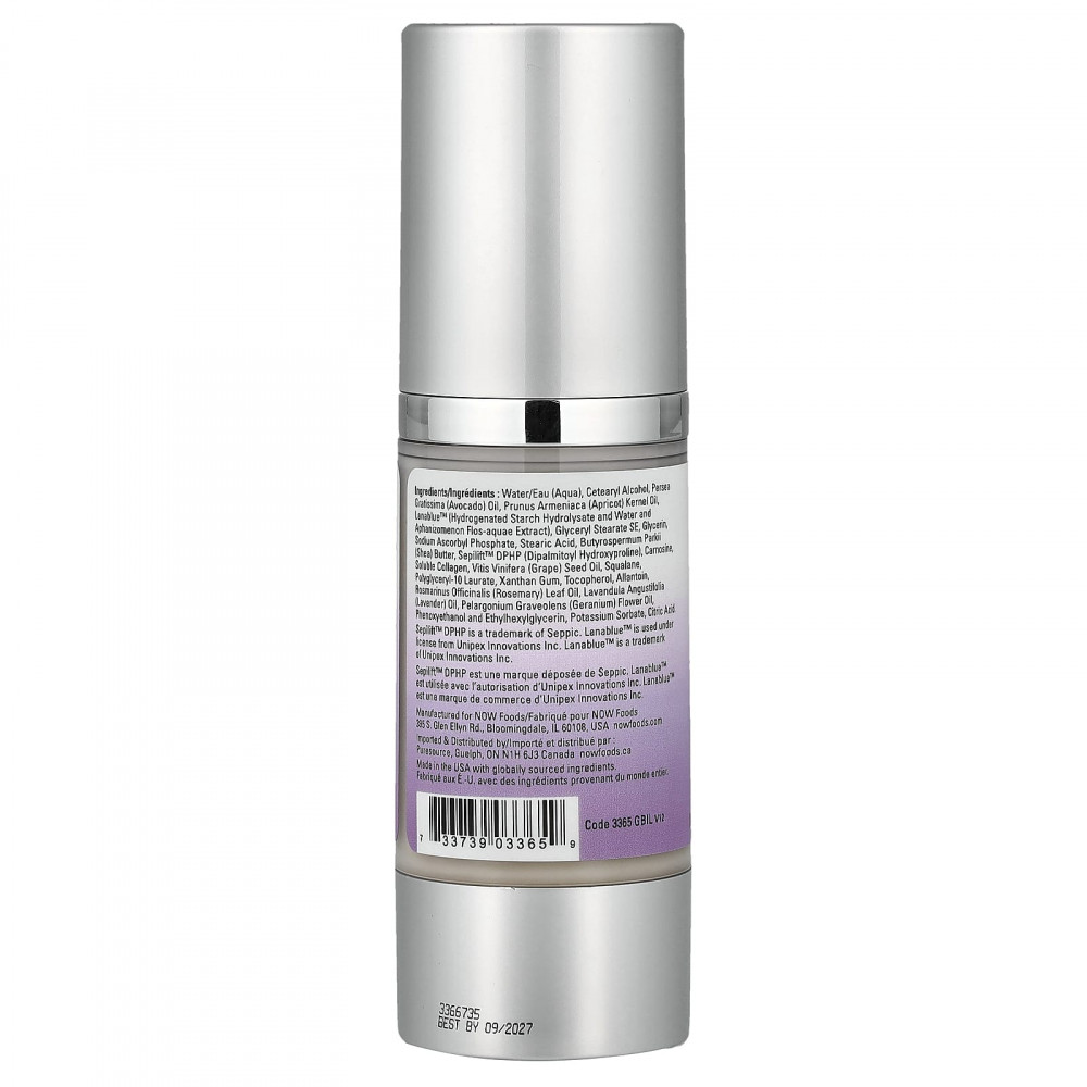 Вода (eau), Цетеариловый спирт, масло авокадо (Persea gratissima), масло из косточек абрикоса (Prunus armeniaca), Lanablue™ (гидролизат гидрогенизированного крахмала, вода и экстракт афанизоменона флос-акве), глицерилстеарат SE, глицерин, аскорбил фосфат натрия, стеариновая кислота, Масло Butyrospermum parkii (Ши), дипальмитоил гидроксипролин (sepilift™), карнозина, растворимый коллаген, масло из виноградных косточек (Vitis vinifera), сквалан, полиглицерил-10 лаурат, Ксантановая камедь, Токоферол, Аллантоин, масло из листьев розмарина (Rosmarinus officinalis), лавандовое масло (Lavandula angustifolia), масла из цветков герани (Pelargonium graveolens), феноксиэтанол и этилгексилглицерин, сорбат калия, лимонная кислота.