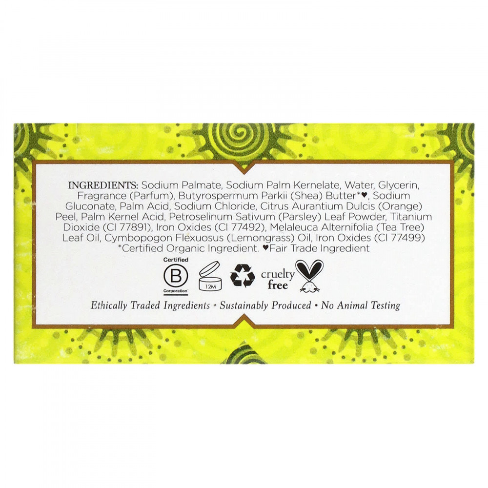 Пальмитат натрия, пальмовый кернелат натрия, вода, глицерин, ароматизатор (отдушка), масло ши (Butyrospermum parkii*♦, глюконат натрия, пальмовая кислота, хлорид натрия, цедра сладкого апельсина, пальмоядровая кислота, порошок листа петрушки (Petroselinum sativum), диоксид титана (cl 77891), оксид железа (cl 77492), масло чайного дерева (Melaleuca alternifolia) (лист), масло лемонграса (Cymbopogon flexuosus), оксиды железа (CI 77499).